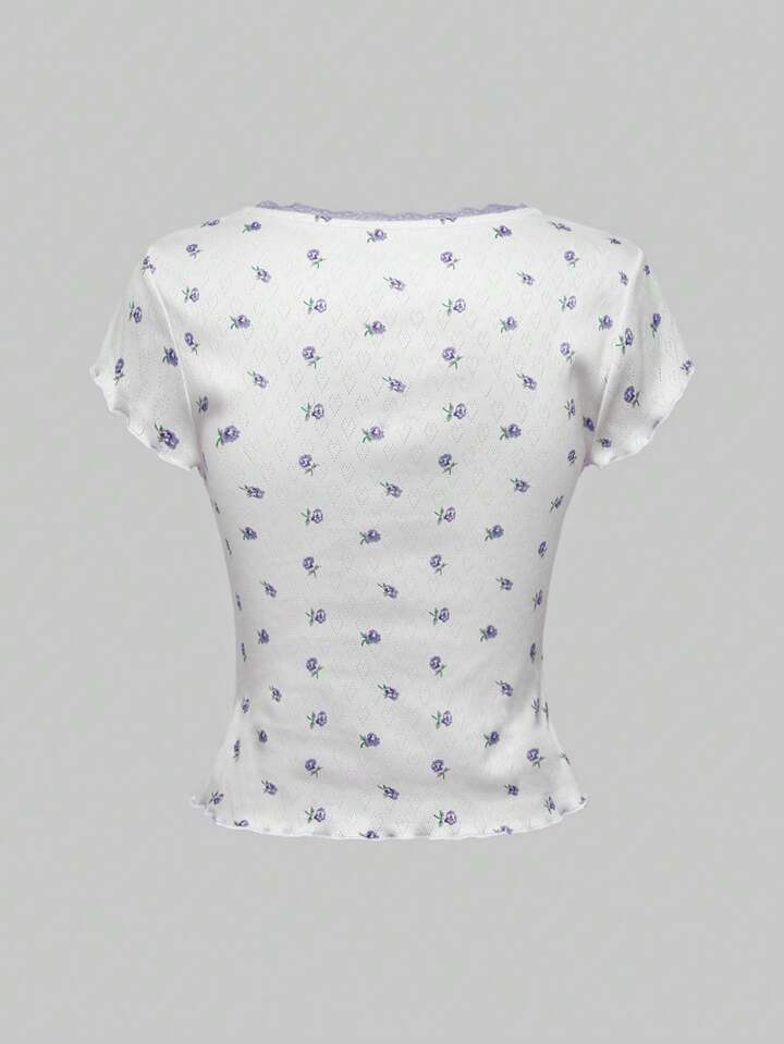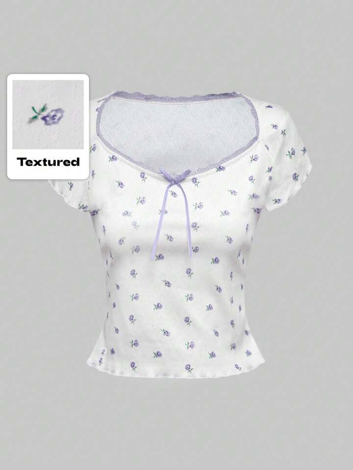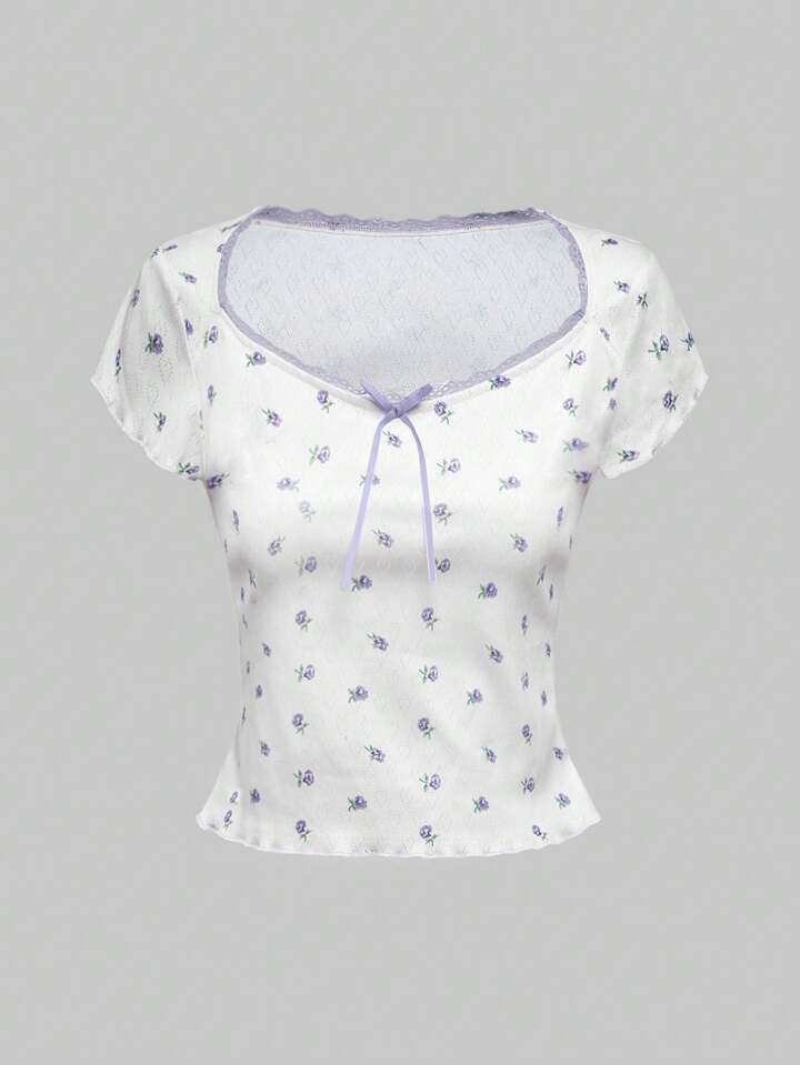 Kawaii Mori Girl Stil lässiges Ditsy Blumen elastisches figurbetontes Schleife Sexy T-Shirt für Frauen