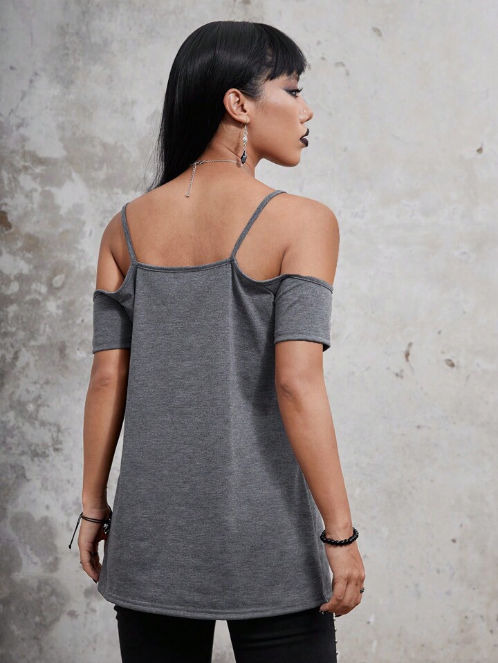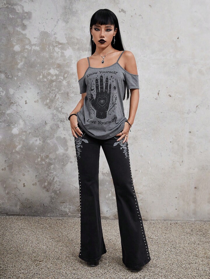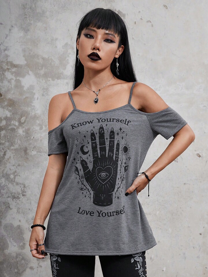 Mystic heart T-Shirt mit Hand & Buchstabe Grafik, schulterfrei
