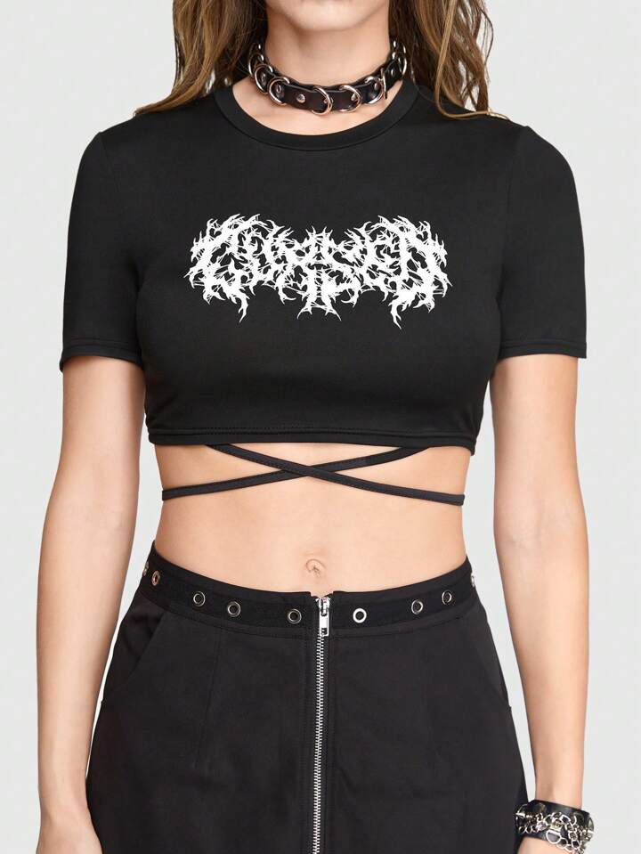 Nemons Damen-Crop-shirt Mit Buchstabe Muster Und Taillen-bindeband