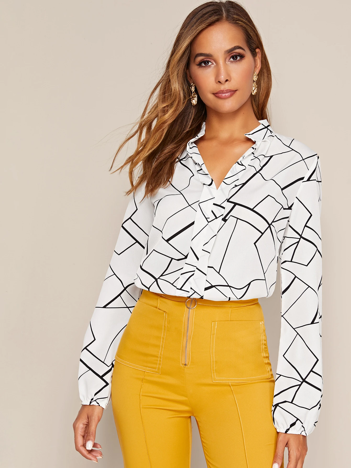 Bluse mit eingekerbtem Kragen und Geometrie Muster