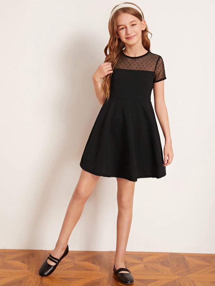 Nova Glow Tween Mädchen Minimalistisches Mesh-Patchwork-Kleid mit kurzen Ärmeln und Rundhalsausschnitt