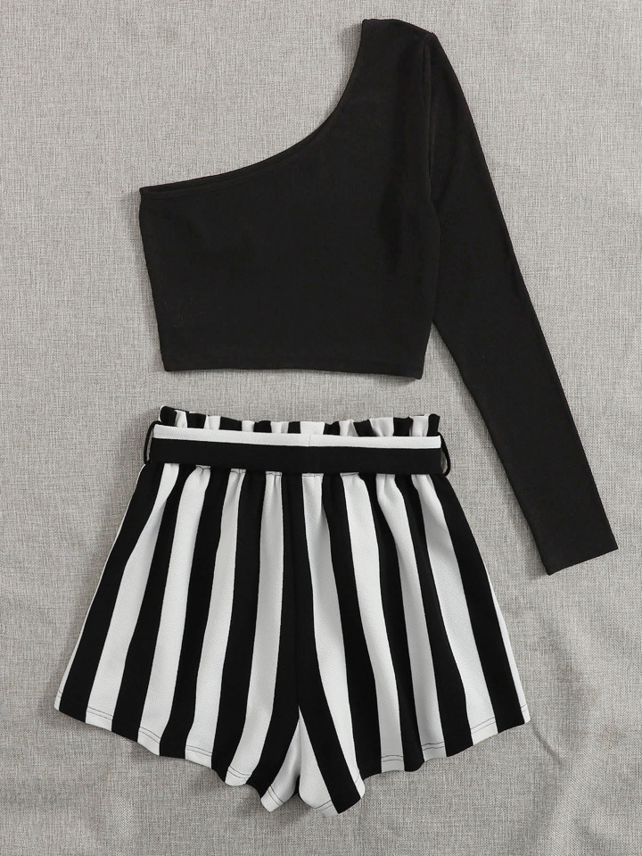 Top mit einer Schulter & Shorts mit Papiertasche Taille und Streifen