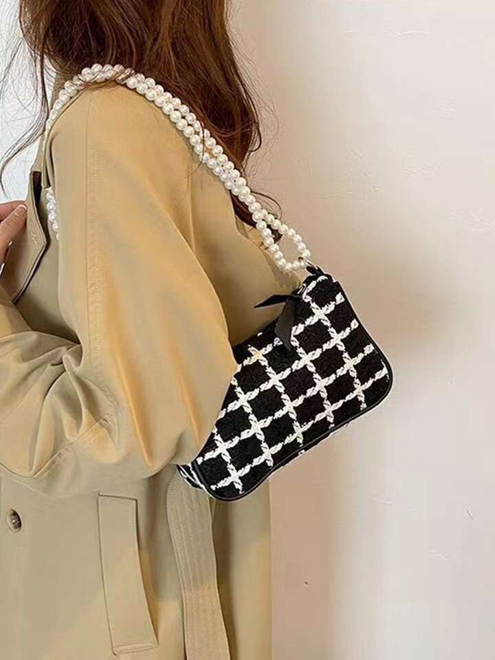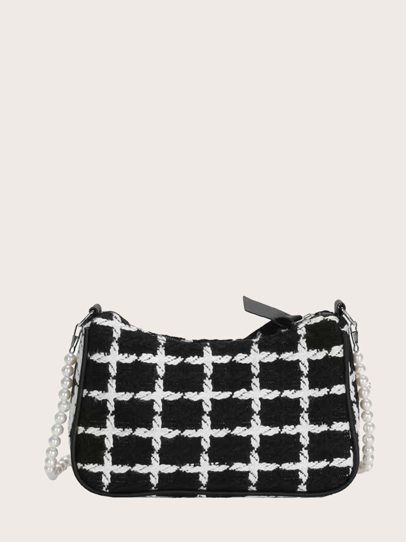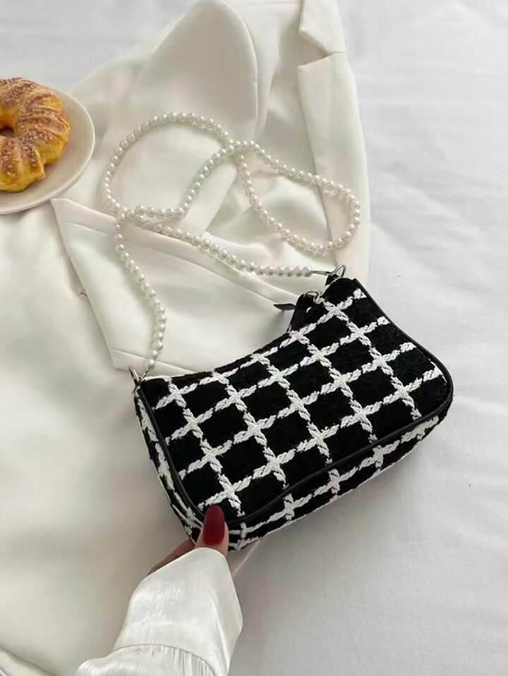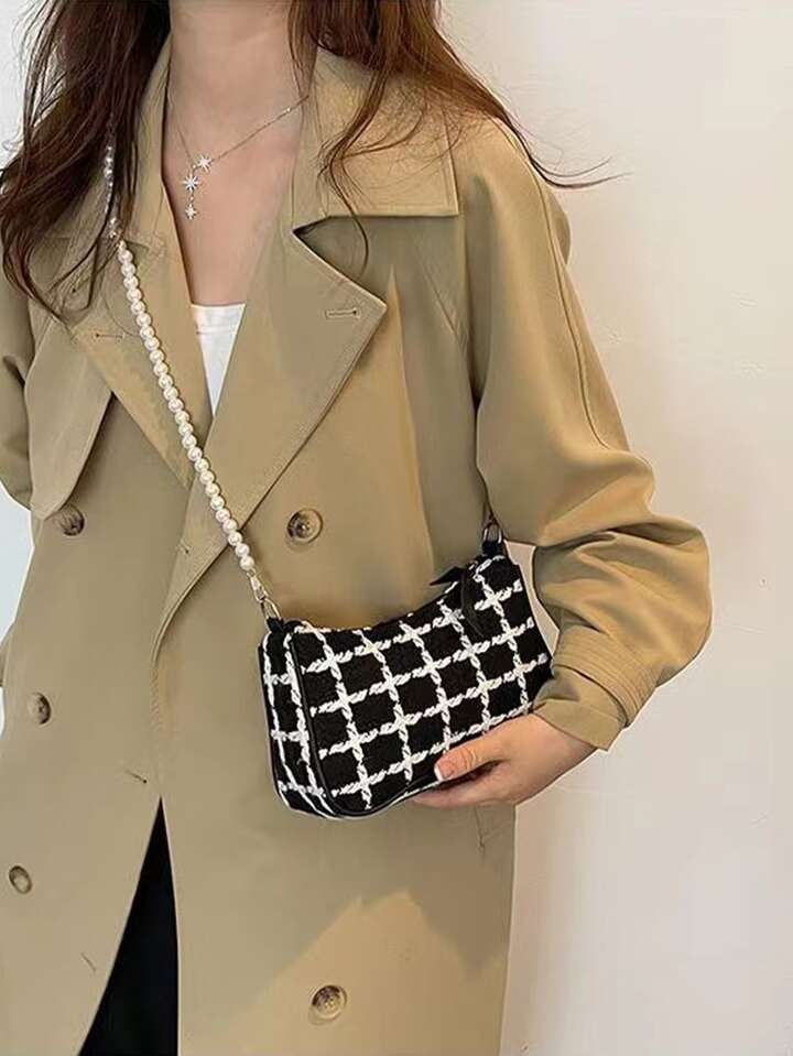 Umhängetasche mit Plaid Muster, Kunstperle Segeltuch