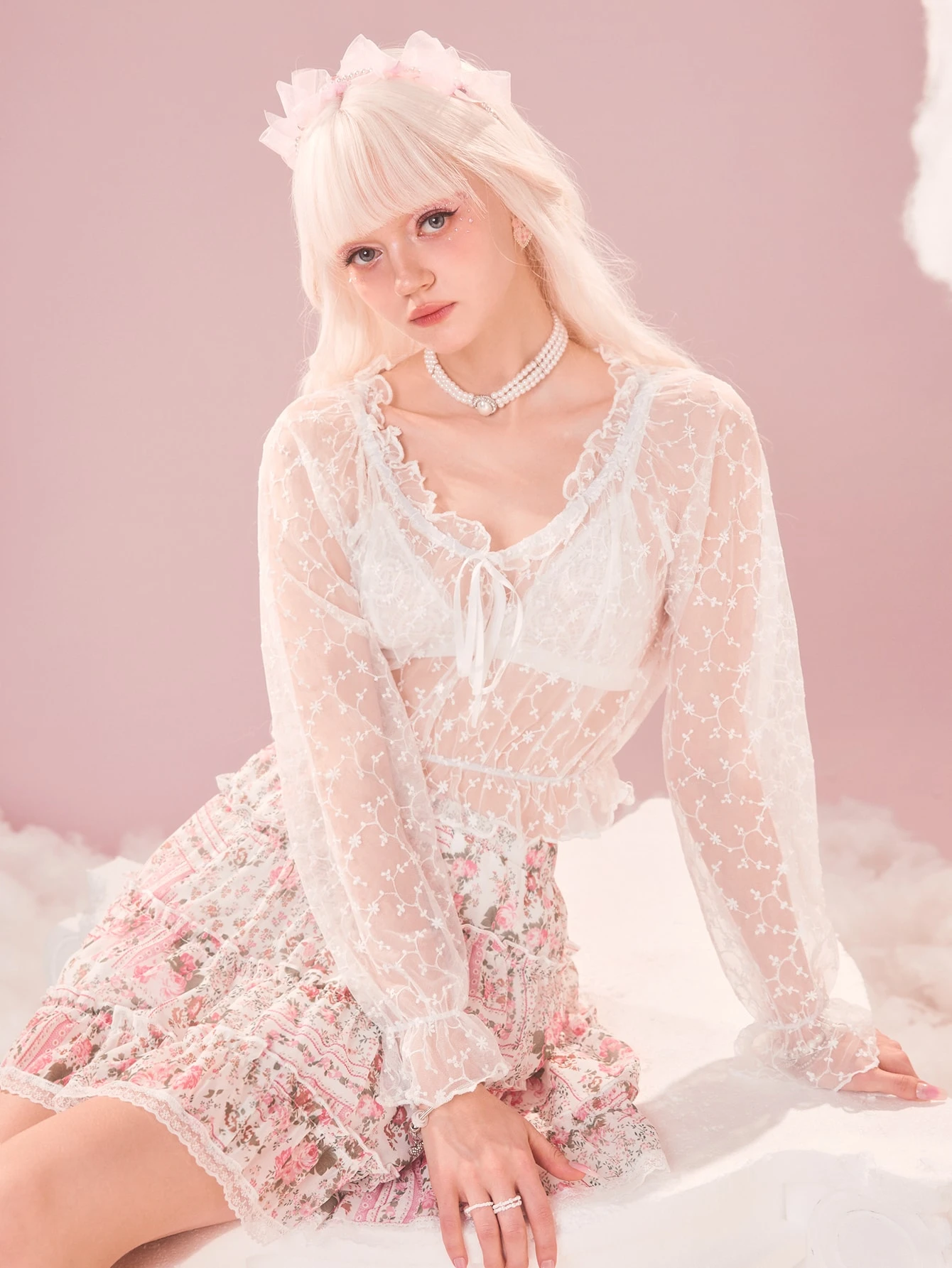 Bluse mit Pflanzen Stickerei Rüschenbesatz, Volant Ärmeln