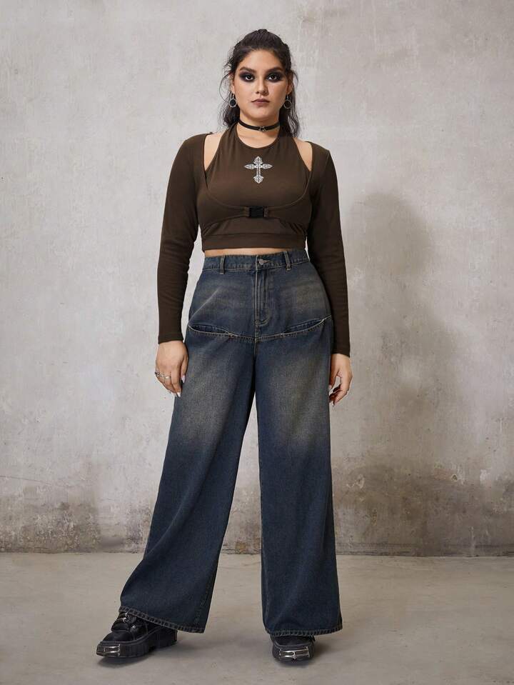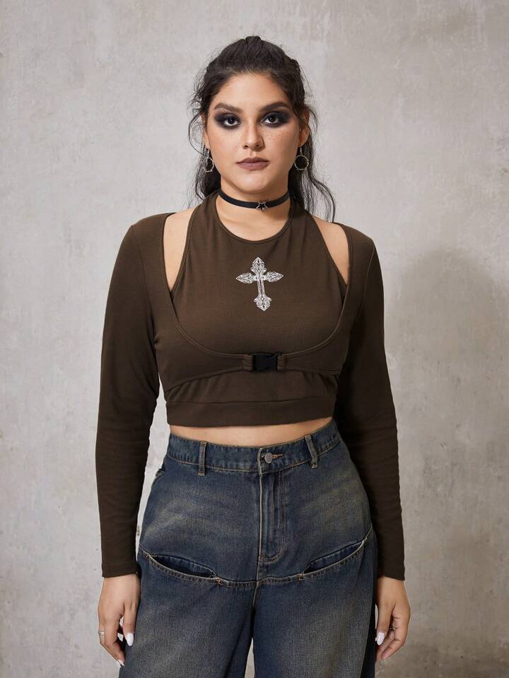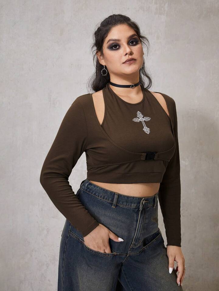 Große Größen Neckholder Crop Top mit Kreuzmuster und Schnallendetail