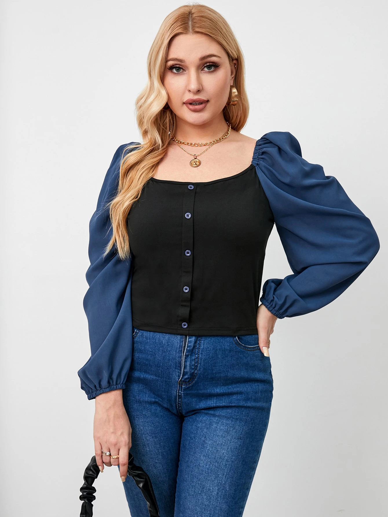 Top mit Farbblock, Puffärmeln, unecht Knopf