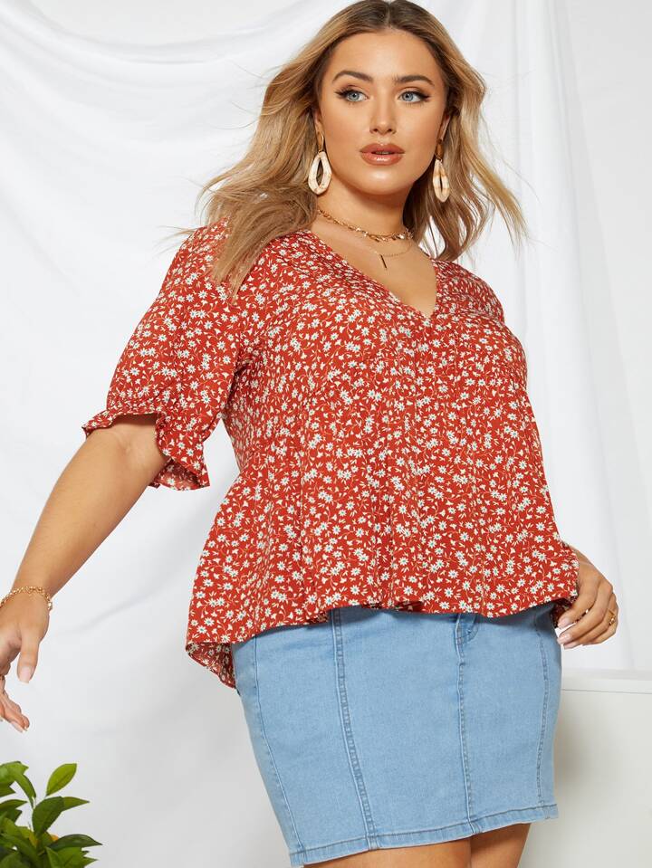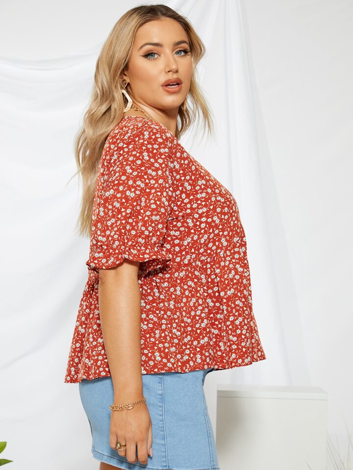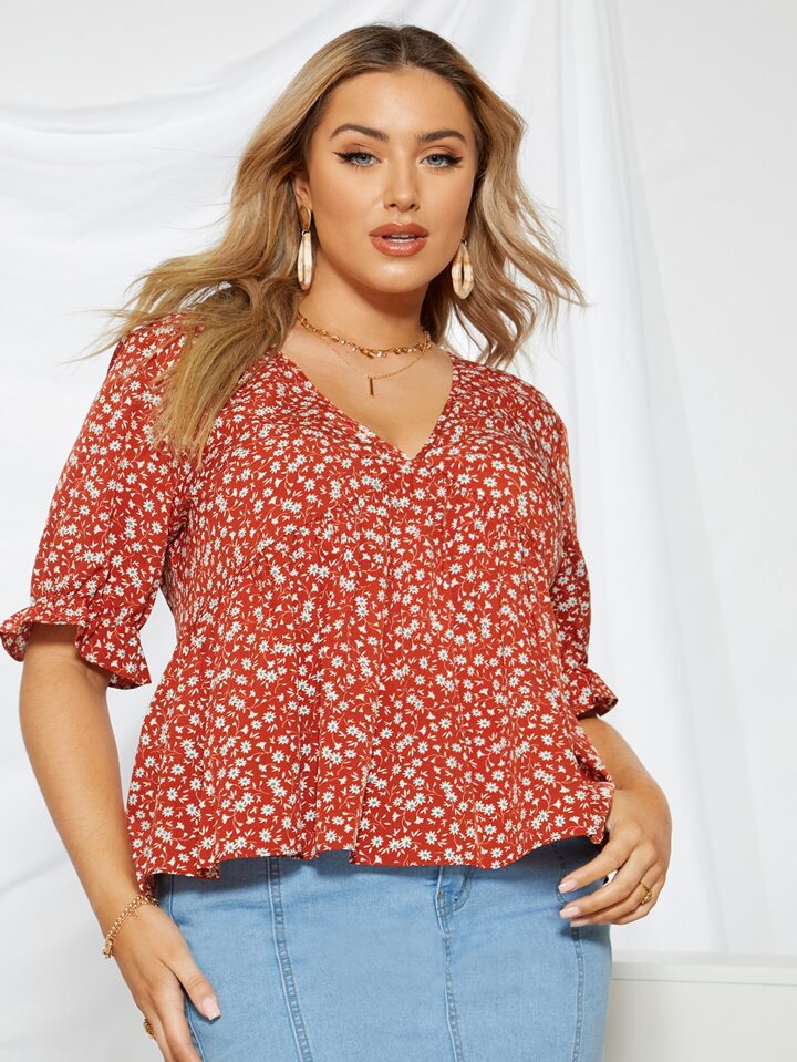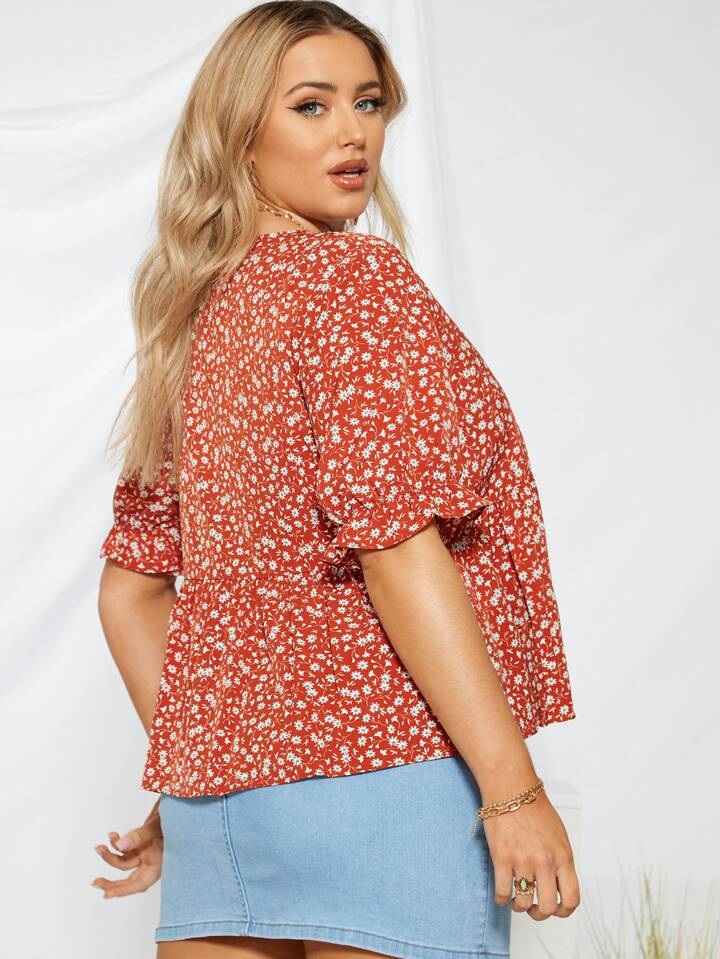 Bluse mit Blümchen Muster, Schößchenärmeln und V Kragen
