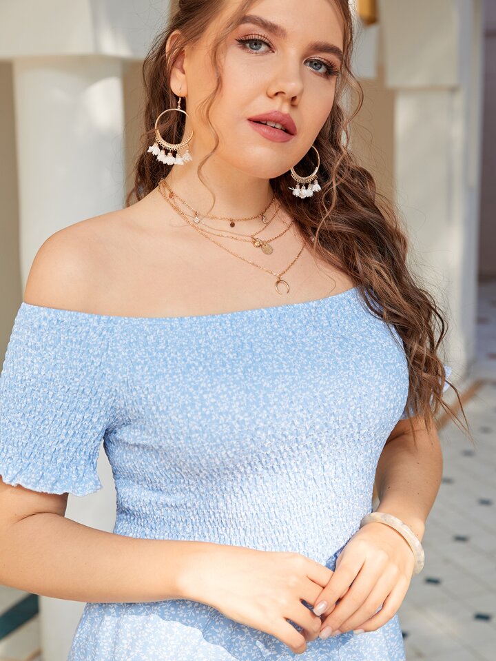 Schulterfreier Jumpsuit mit Blümchen Muster und Rüschen