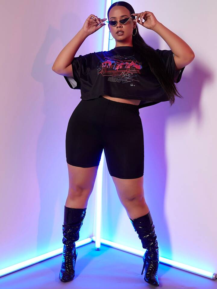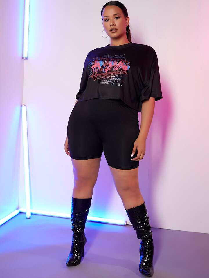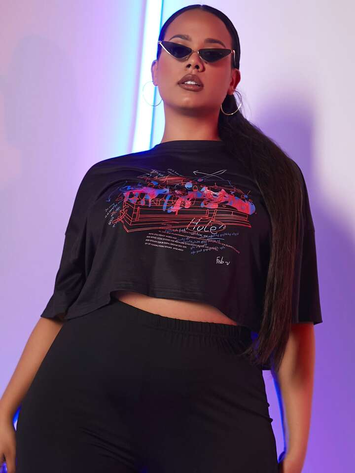 Drop Shoulder Crop T-Shirt mit Figur & Geometrie Muster