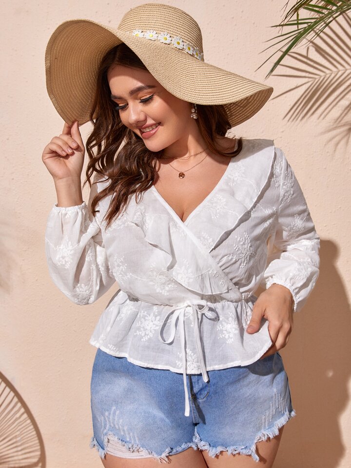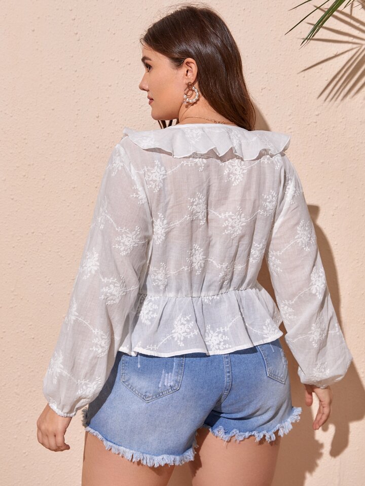 Schößchenbluse mit Blume Stickerei, Rüschenbesatz, Laternenärmeln, Knoten vorn