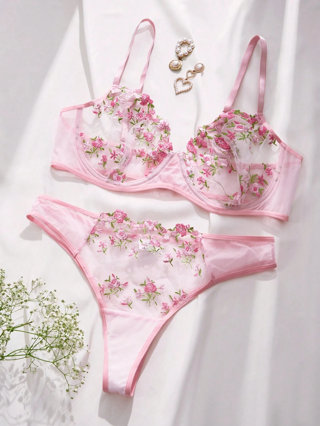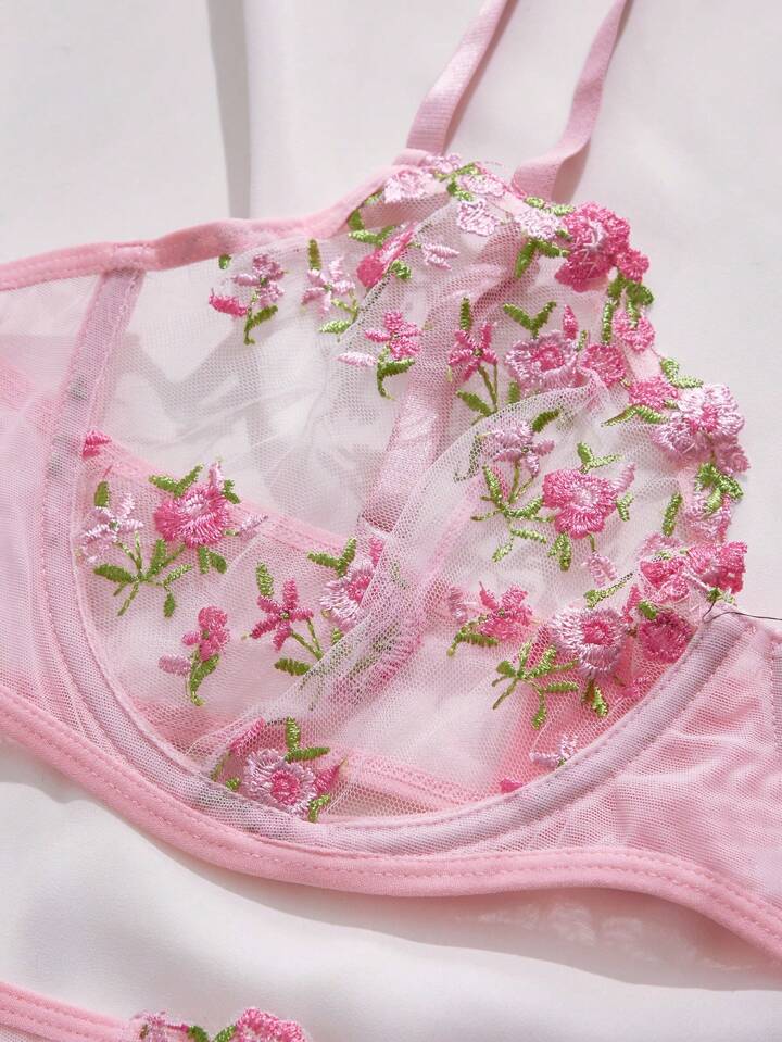 Dessous Set mit Blume Stickerei, transparentem Netz