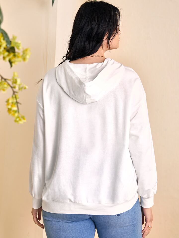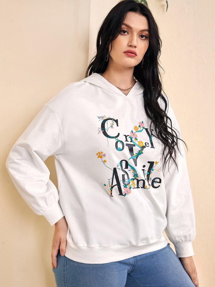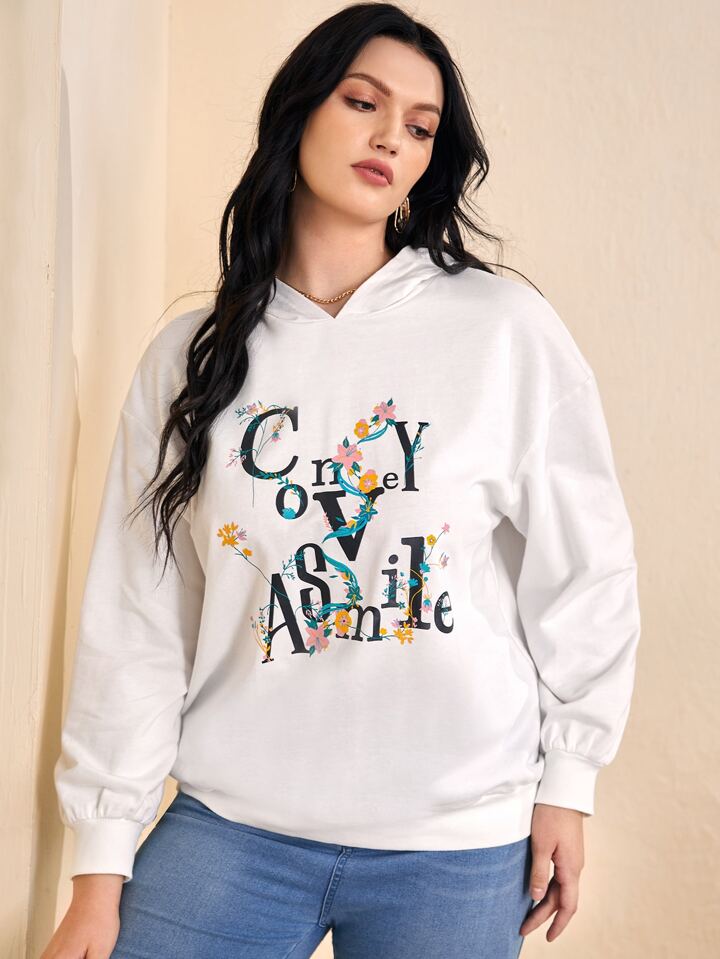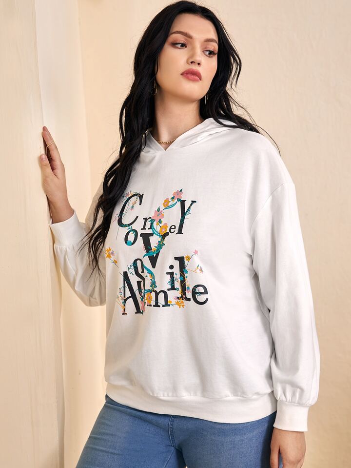 Hoodie mit Blume & Buchstabe Grafik, Drop Shoulder