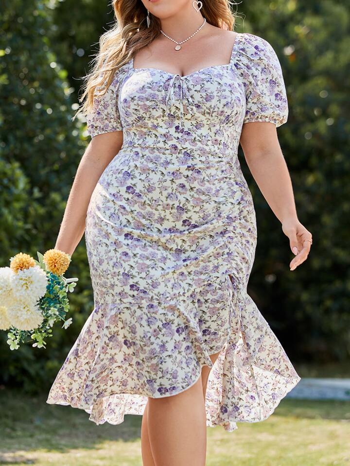 Kleid mit Blume Muster, Band vorne, Puffärmeln, Stufensaum