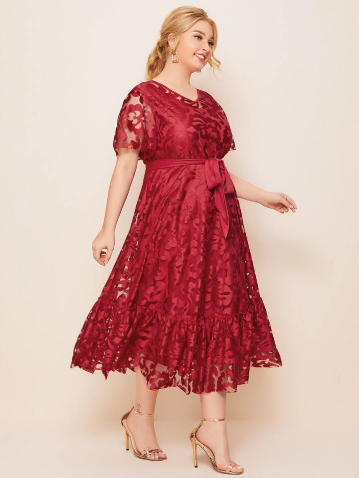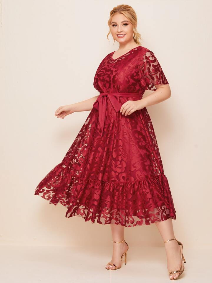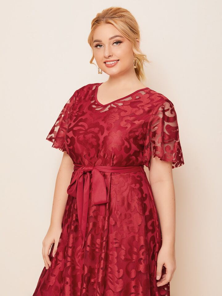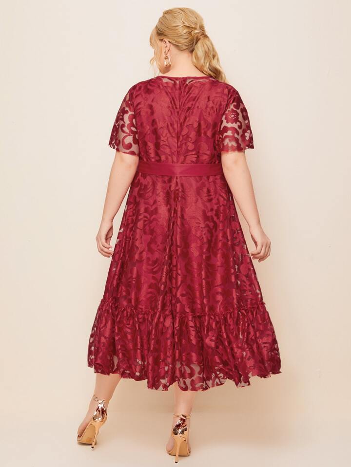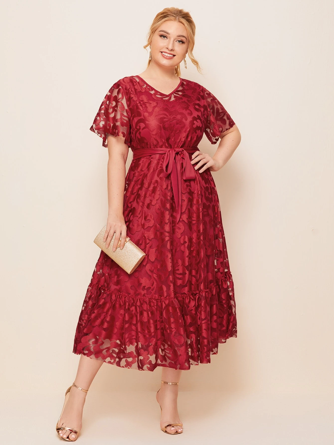 Kleid mit Flatterärmeln, Schößchen am Saum, Selbstgürtel und Spitze