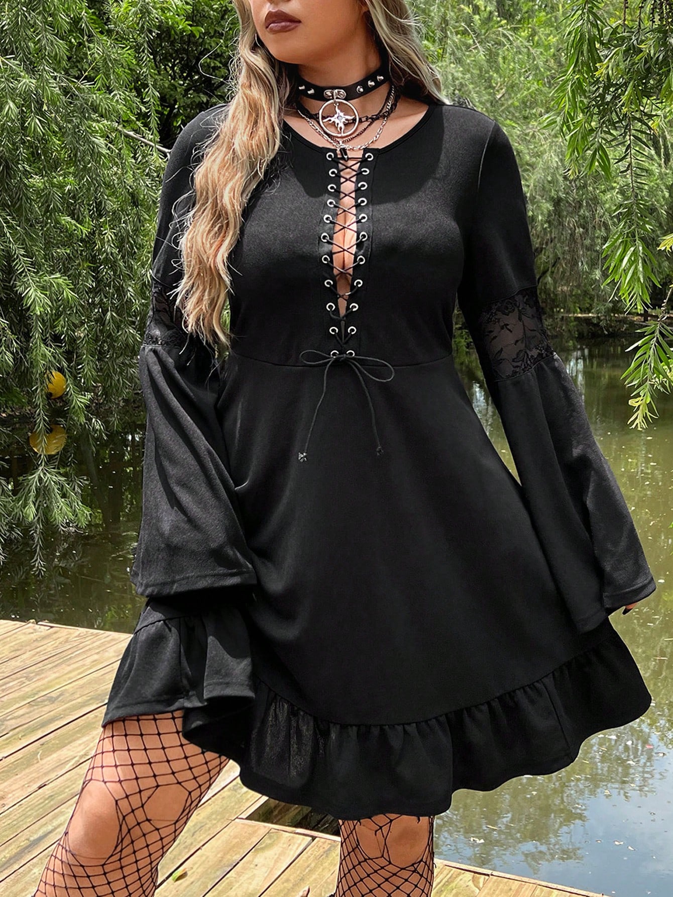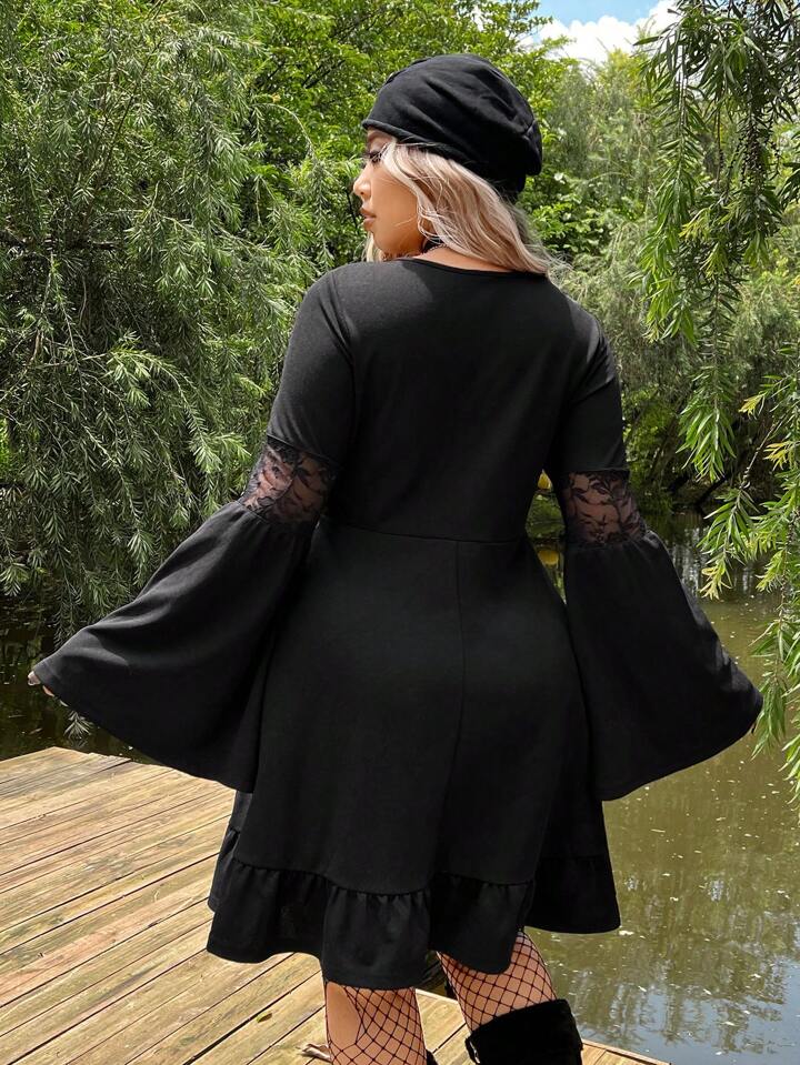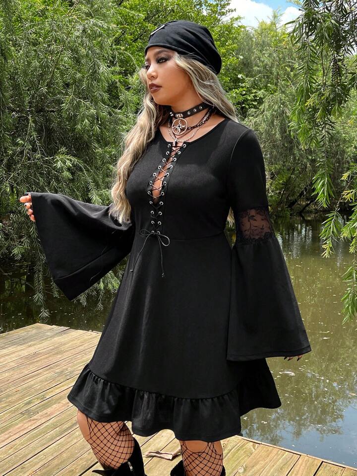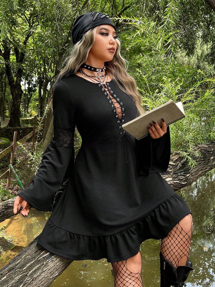 Kleid mit Öse, Band vorne, Volant Ärmeln, Rüschenbesatz,