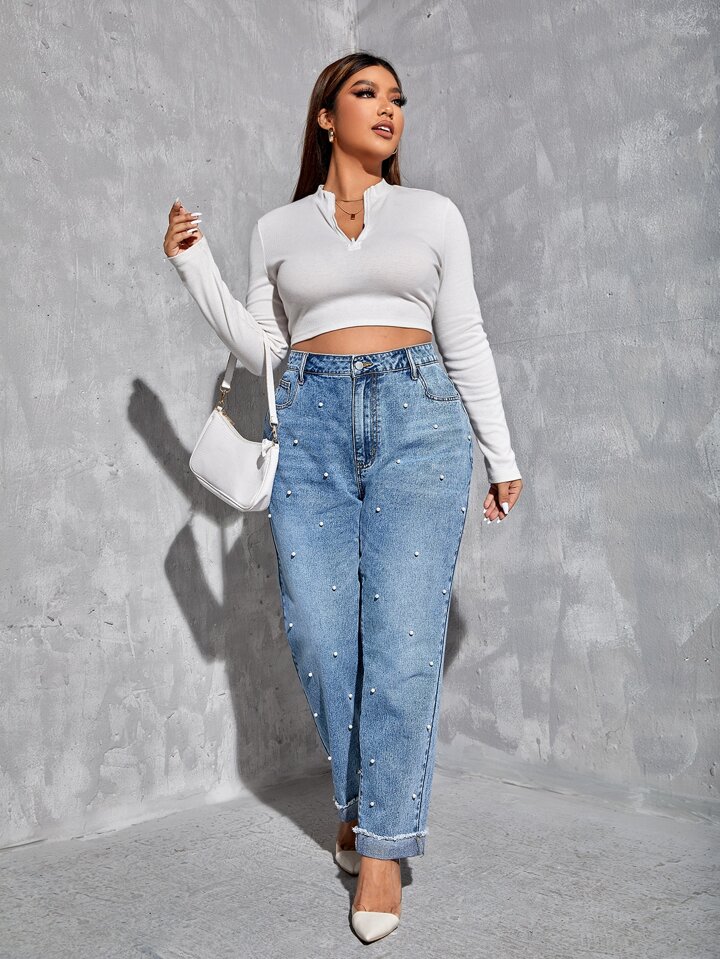 Jeans mit hoher Taille, Perle, unbearbeitetem Saum