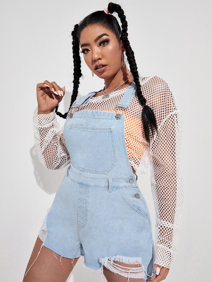Jeans Overall mit Känguru-Tasche, Riss, Fransen