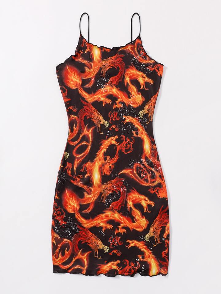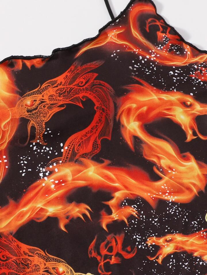 Cami Kleid mit Wellensaum, Feuer & chinesischem Drachen Muster