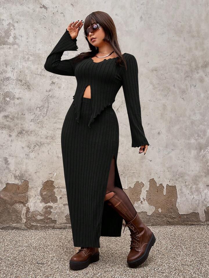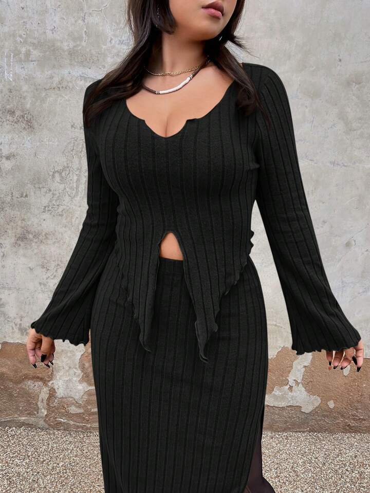 Große Größen Crop Top und Rock mit geschlitztem Saum und gekräuseltem Saum, School