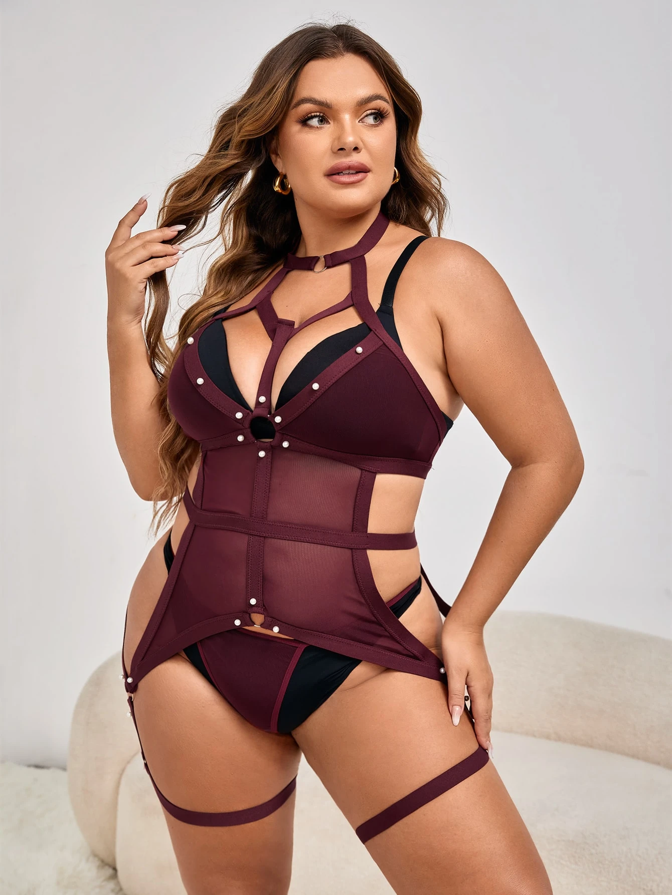 Dessous Set mit Mesh Perle Detail, Ausschnitt, ohne Futter