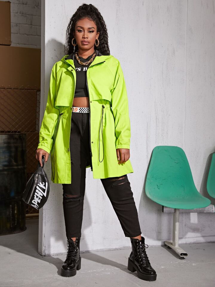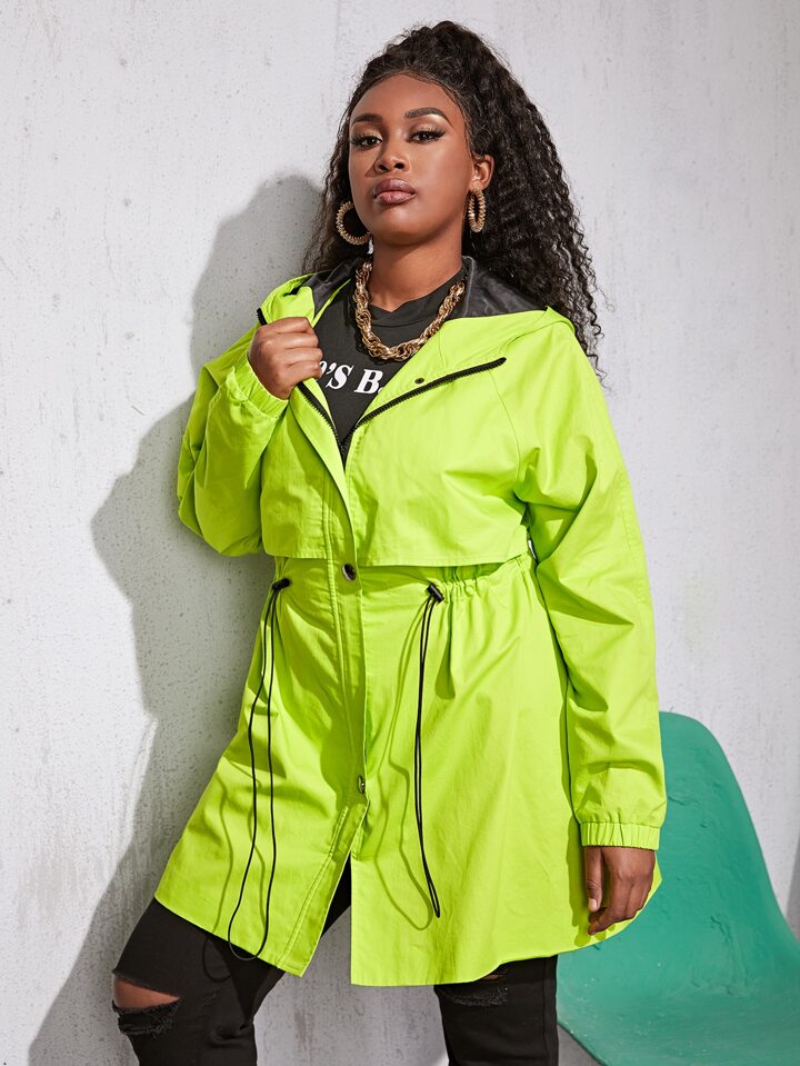 Neon grüner Mantel mit Kordelzug um die Taille und Kapuze