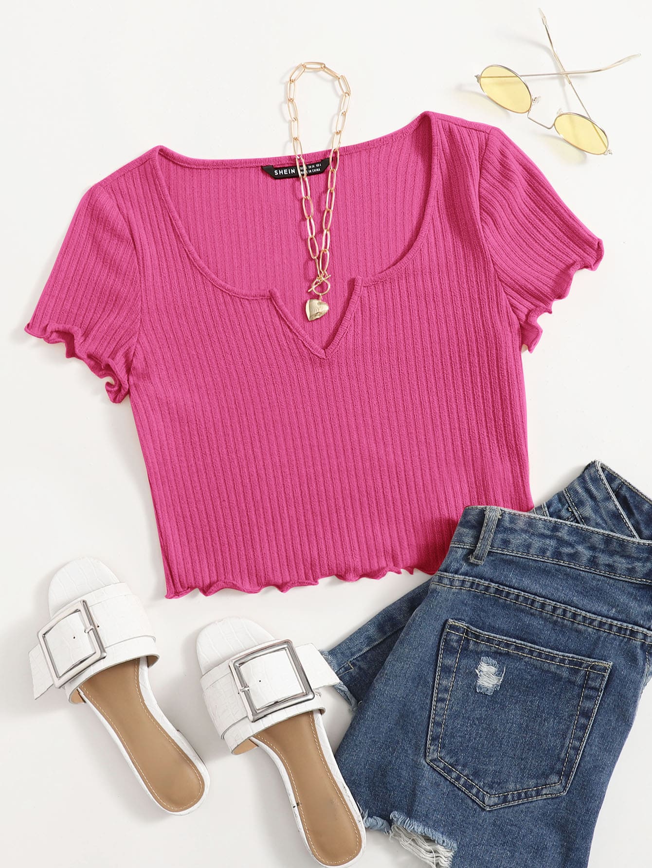 T-Shirt mit eingekerbtem Kragen, Wellensaum