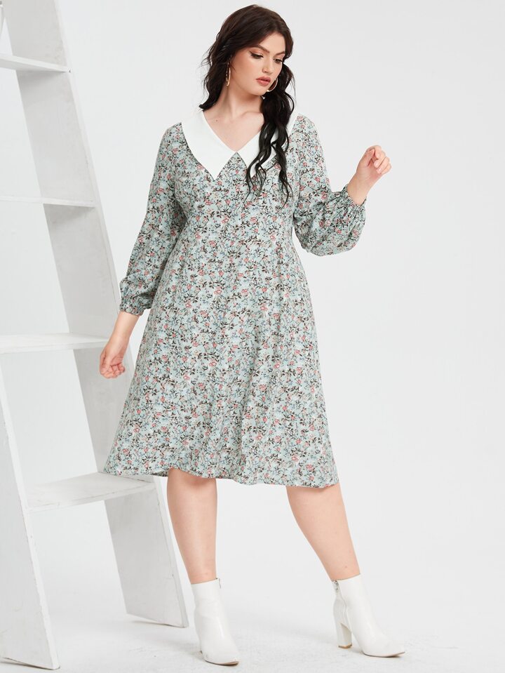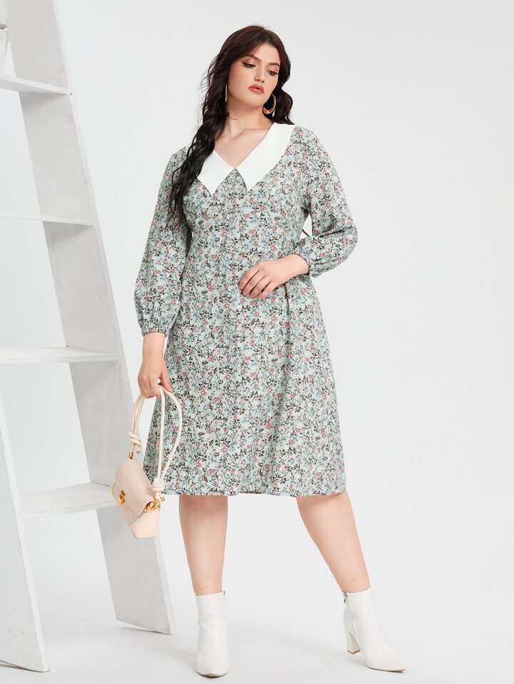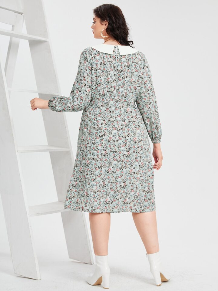 Kleid mit Peter-Pan Kragen, Blume Muster und Laternenärmeln