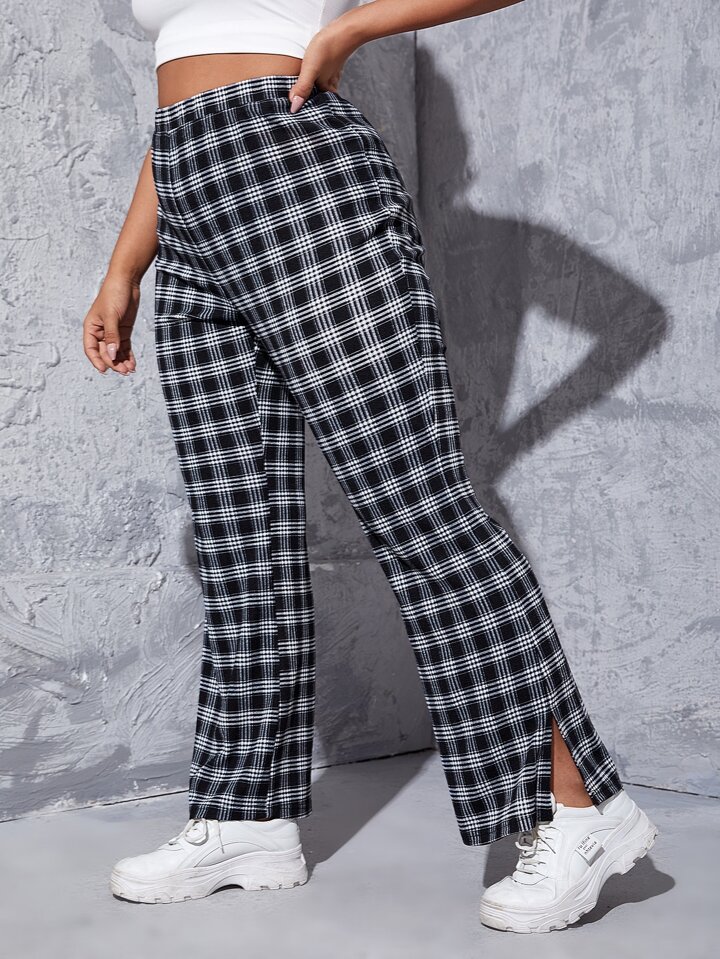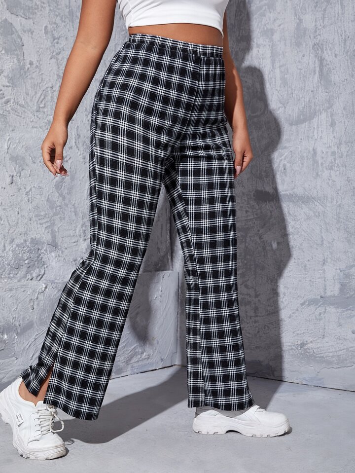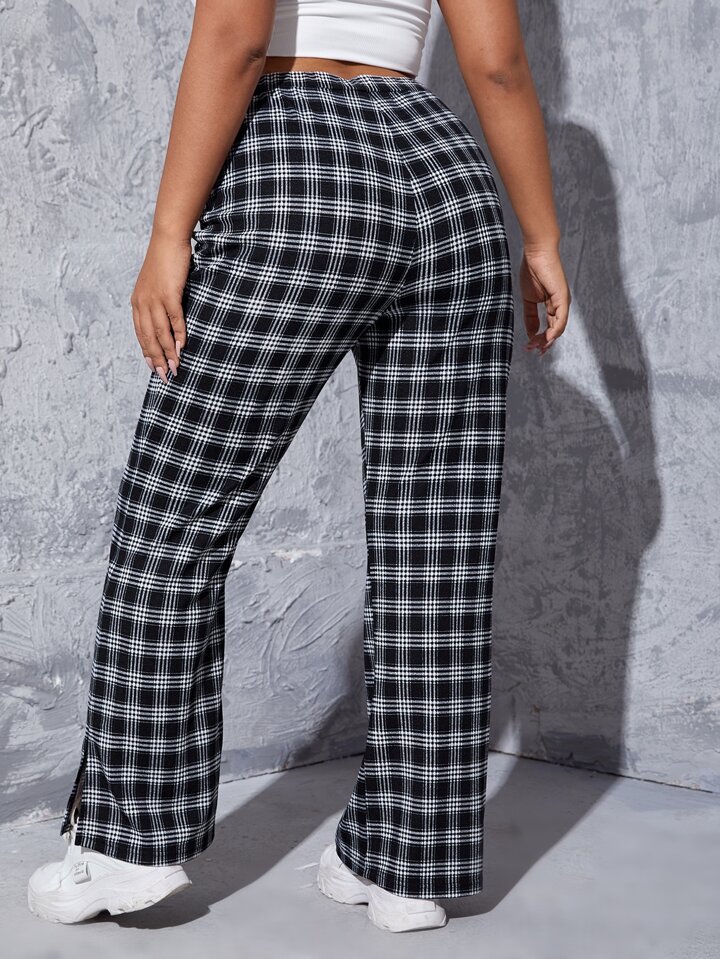 Schlaghose mit Plaid Muster, Schlitz am Saum