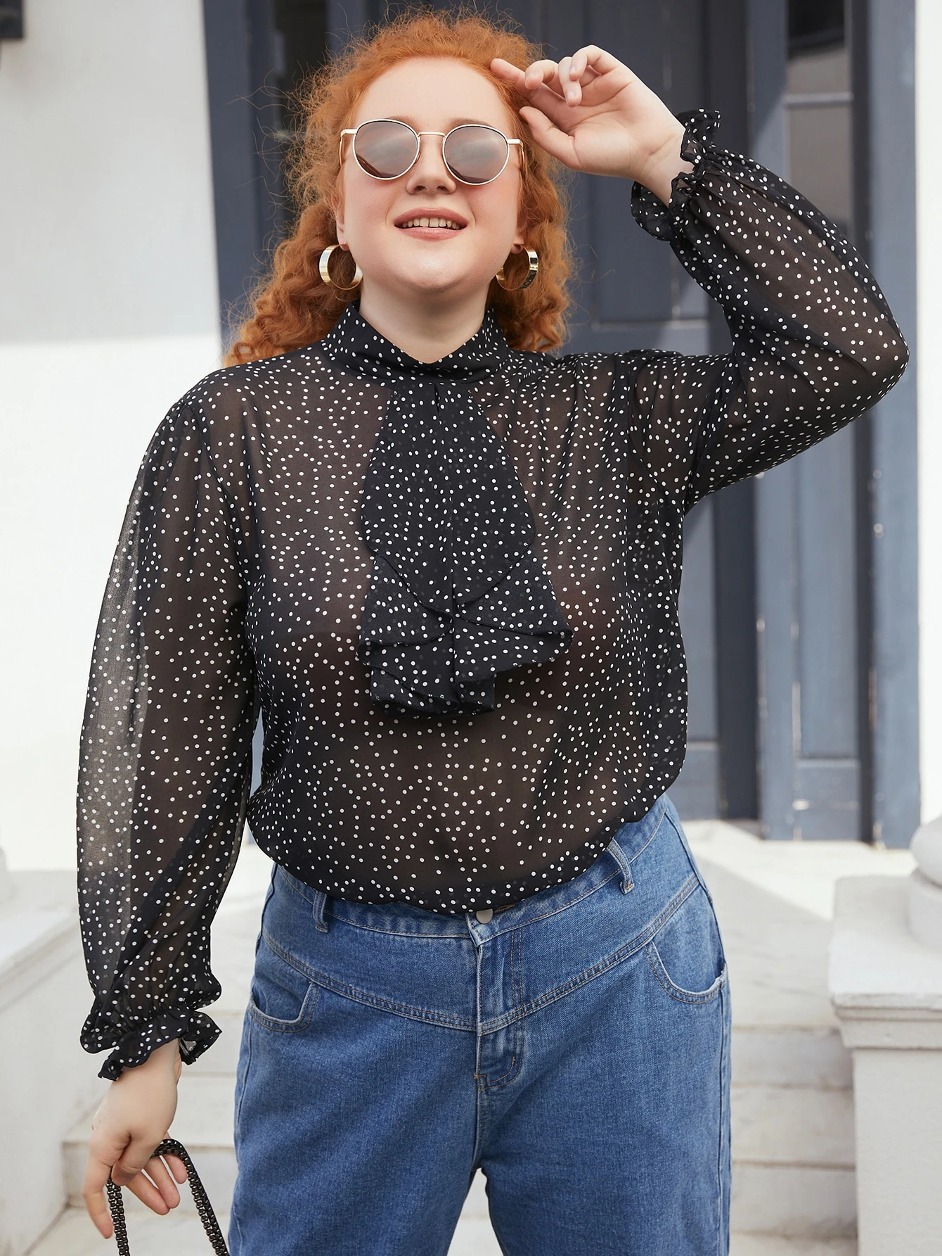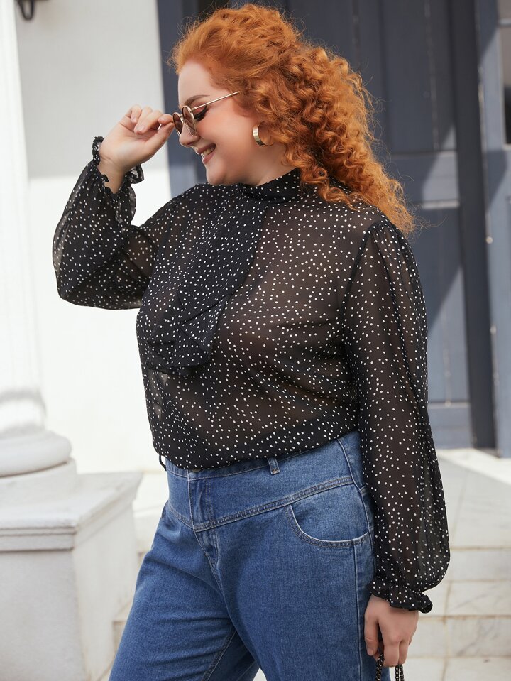 Durchsichtige Bluse mit Punkten Muster und Rüschenbesatz