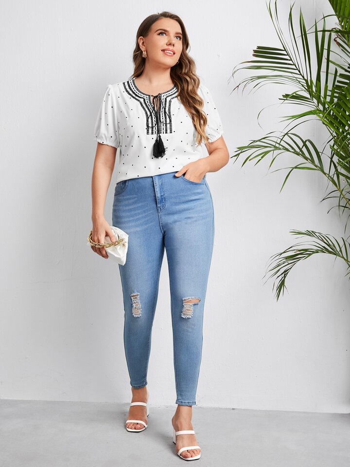 Bluse mit Punkten Muster, Band vorne und eingekerbtem Kragen