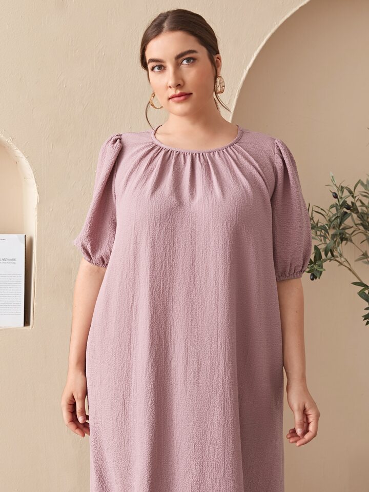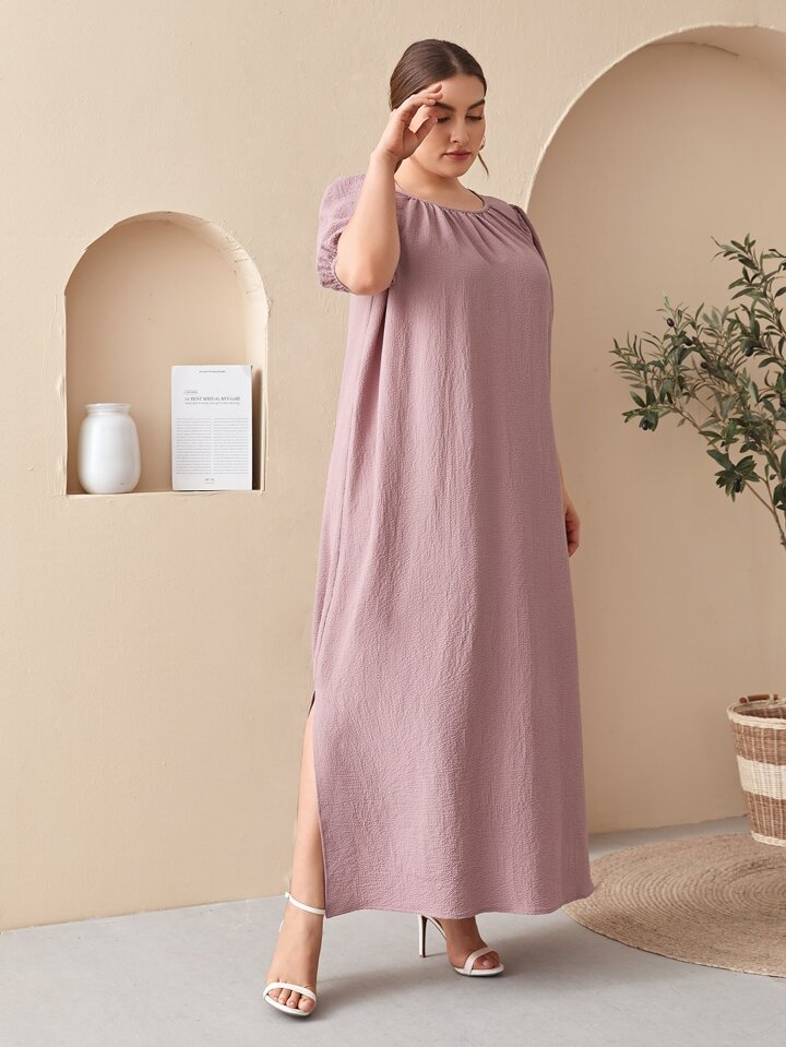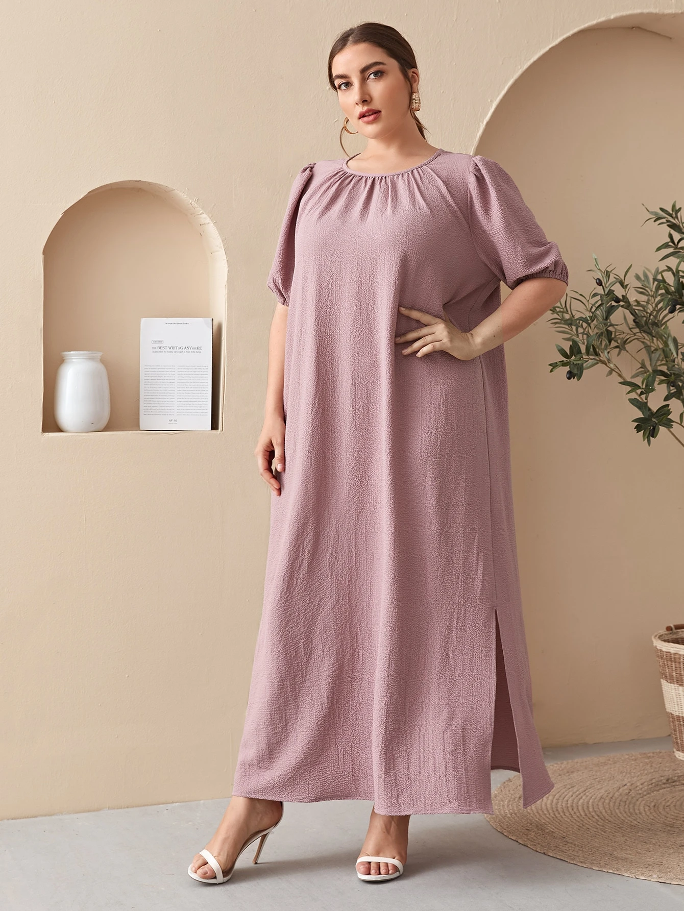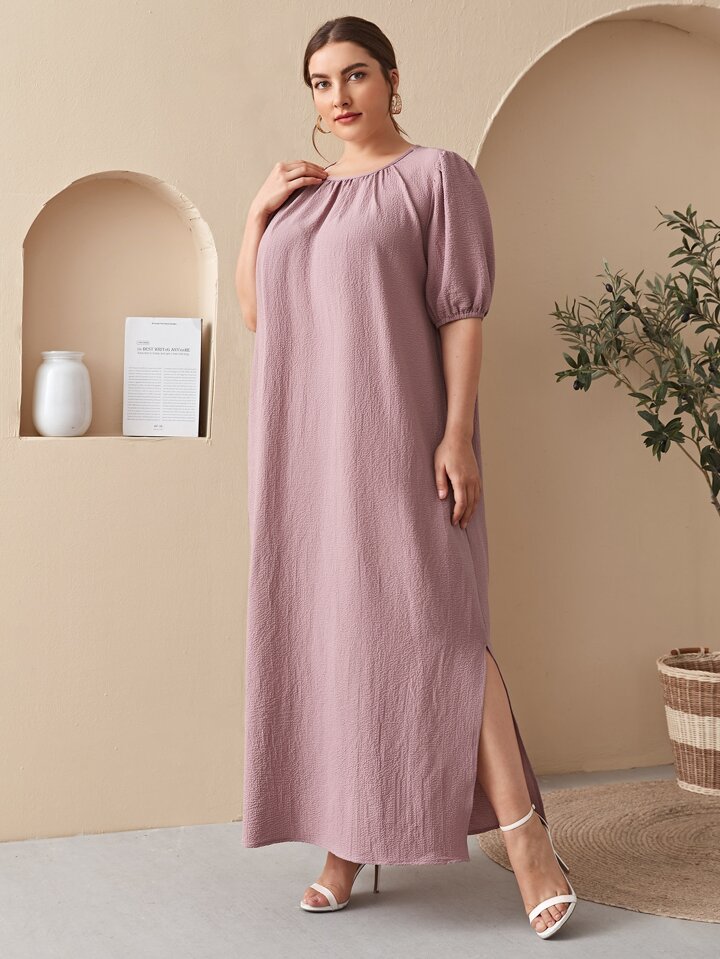 Einfarbiges Kleid mit Puffärmeln und Schlitz