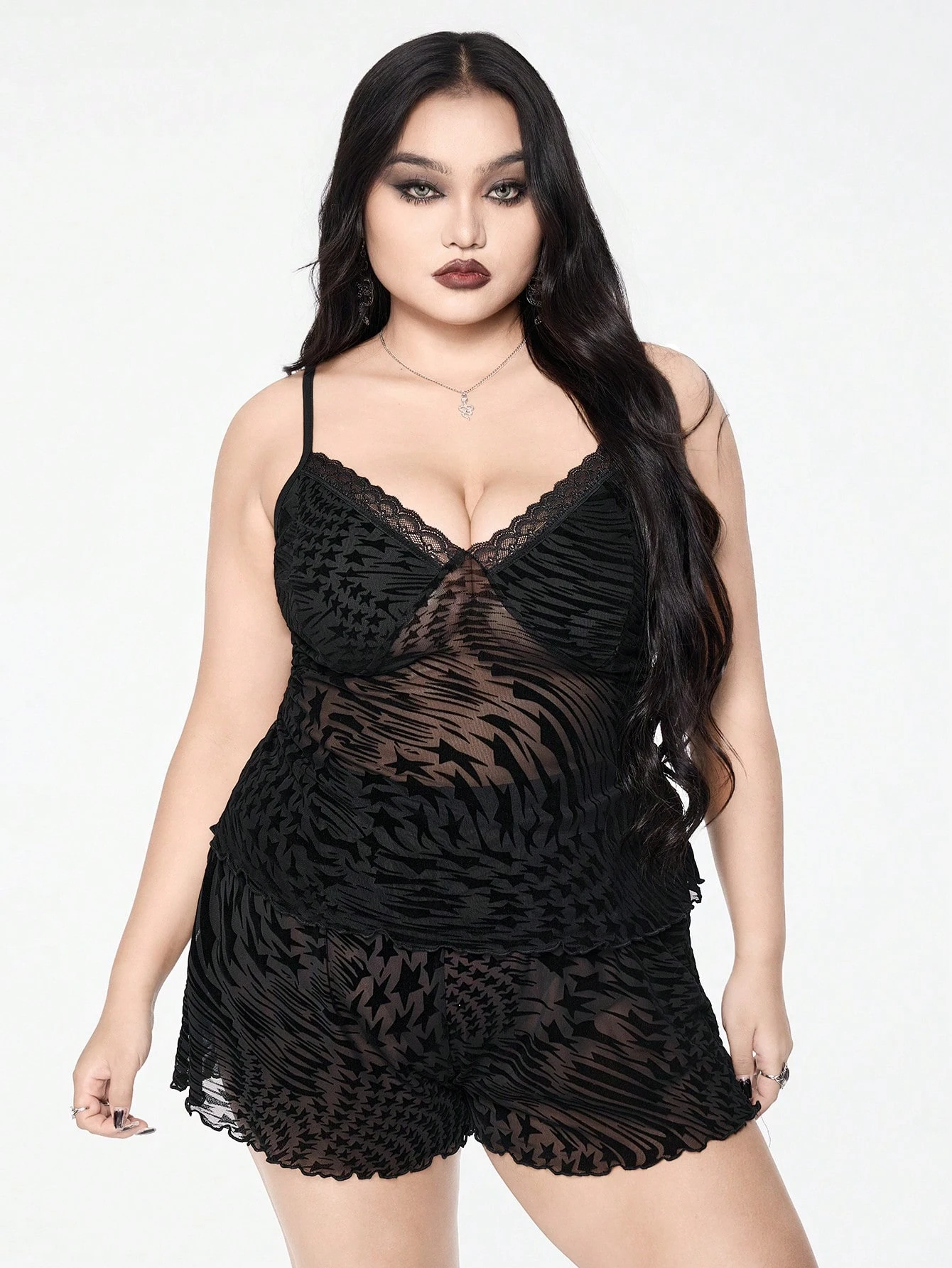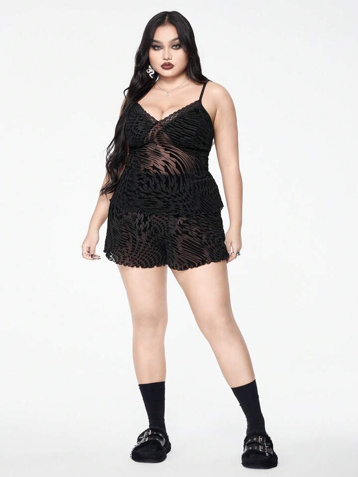 Große Größen Dunkel Gothic Polyester/Spandex Flockierter Jacquard Camisole & Shorts Pyjama Set