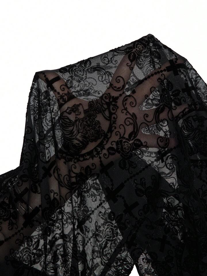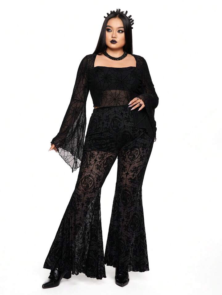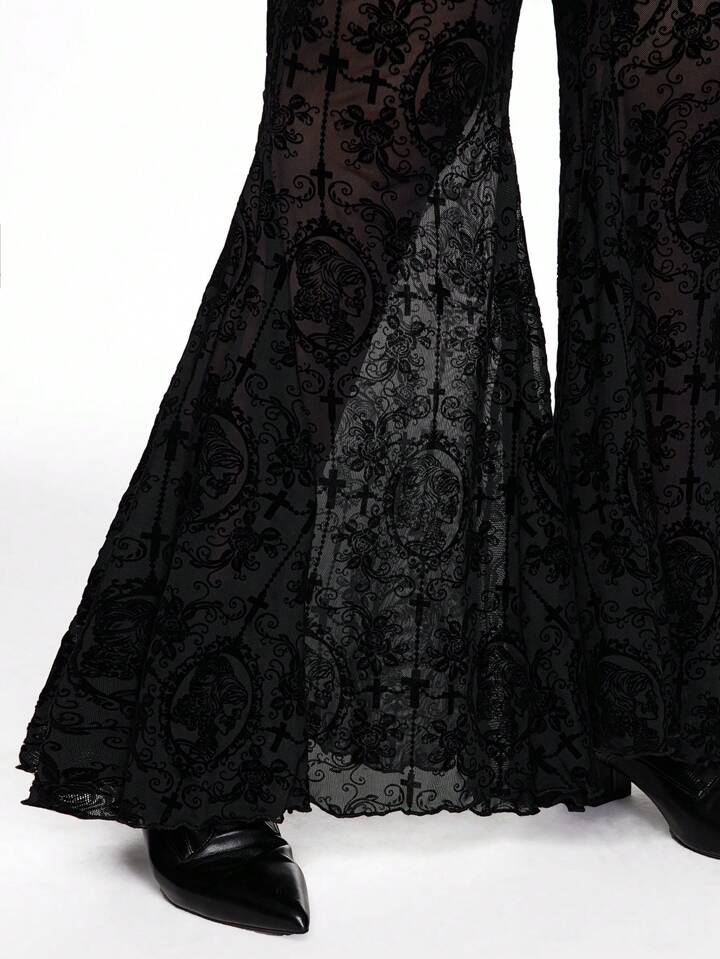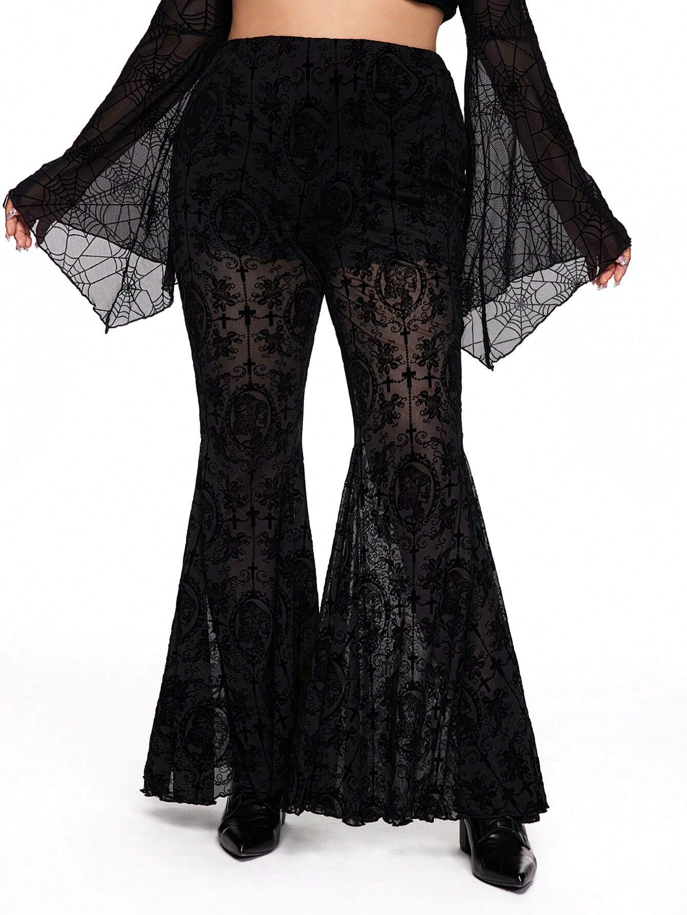Große Größen Hose mit dunklem Gothic Reben-Schädel Muster, Flocked Glockenform