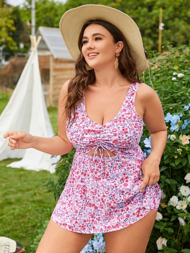 Große Größen Tankini mit Raffung, Cut-Outs und Ditsy Blumen Muster für den Sommerstrand