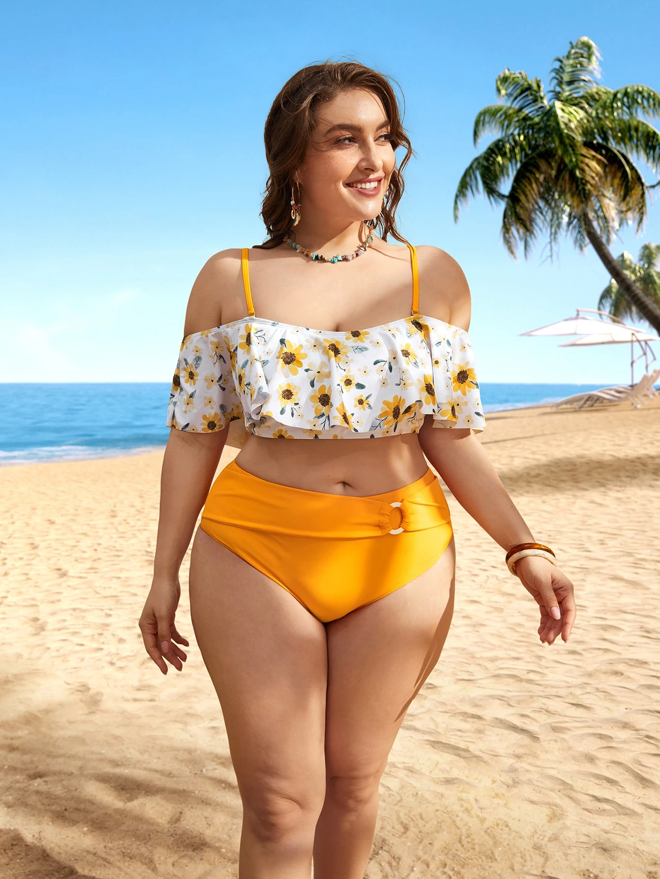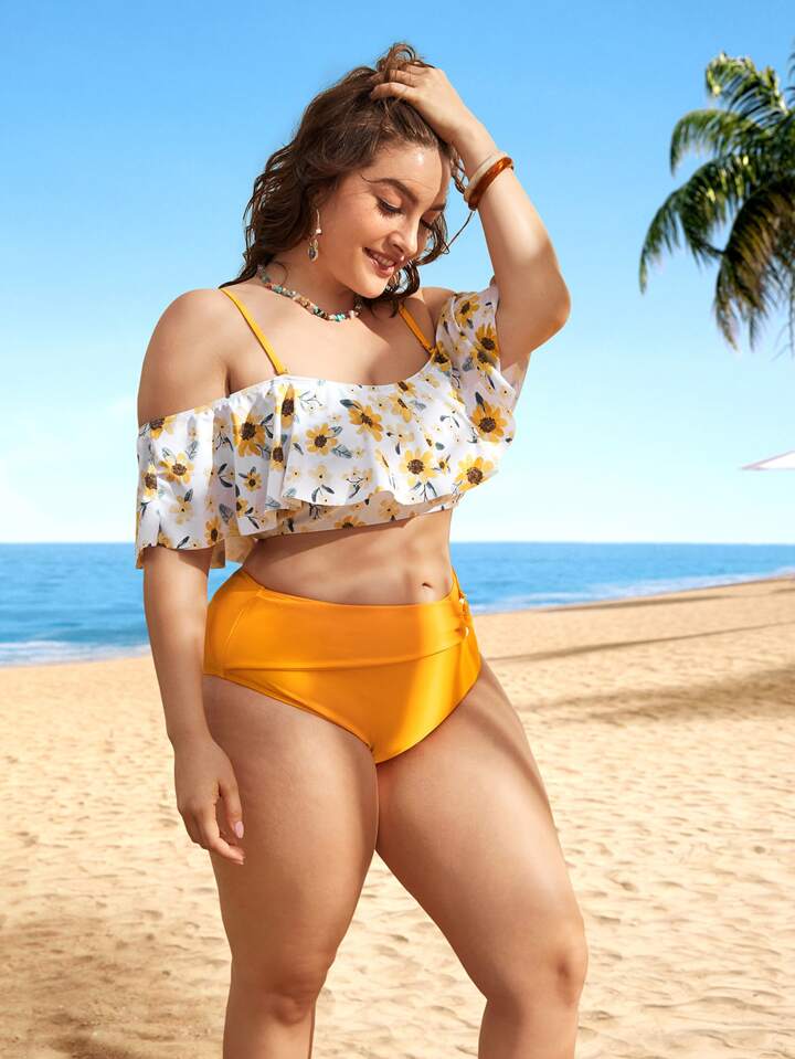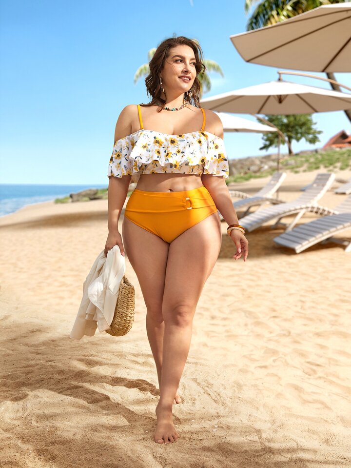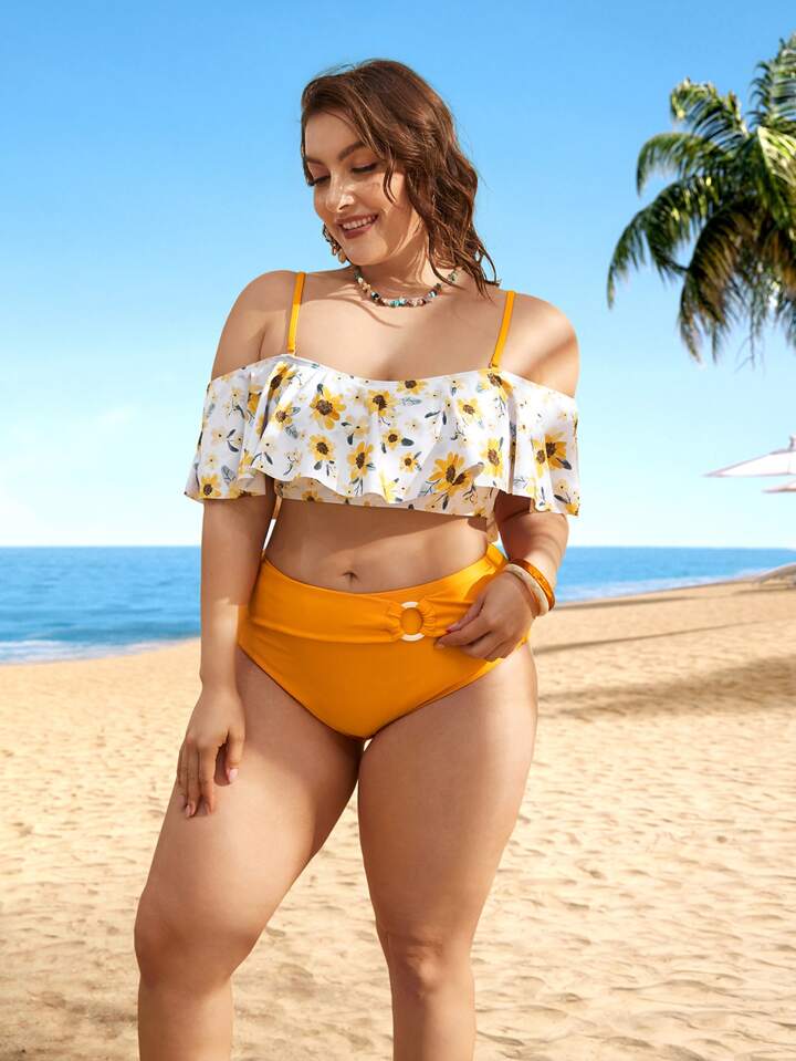 Große Größen Blumenmuster Bikini Set mit Off-Shoulder Design für den Sommerstrand