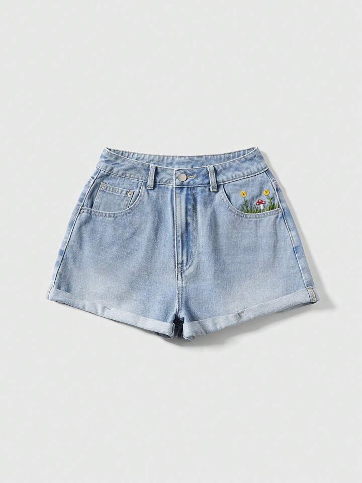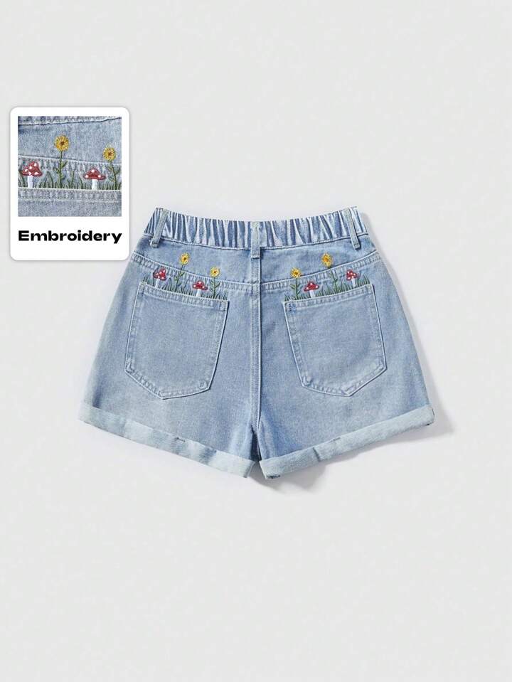 Kurze Oversize Mädchen Lässig Shorts mit süßer Tasche, Stickerei mit Pilz & Sonnenblume, A-Linie mit umgeschlagenem Saum, Jeans