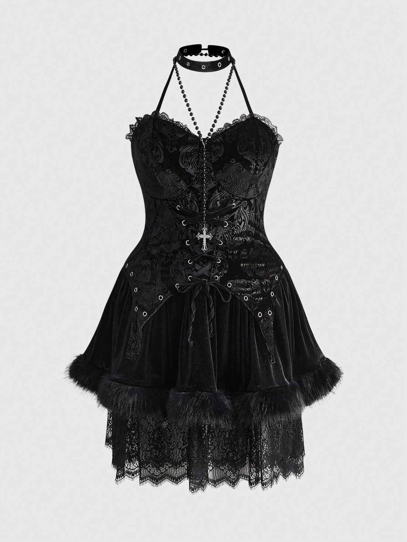 Große Größen Gothic Plüsch Vintage Kleid, luxuriöser Plüsch, Quaste, Fell, Spitze Patchwork ausgestellter Saum Kleid, Herbst/Winter Gothic Stil Große Größen Damen Kleid, elegantes Luxus Große Größen Schwarzes Kleid für Party, Bankett, Zusammenkunft
