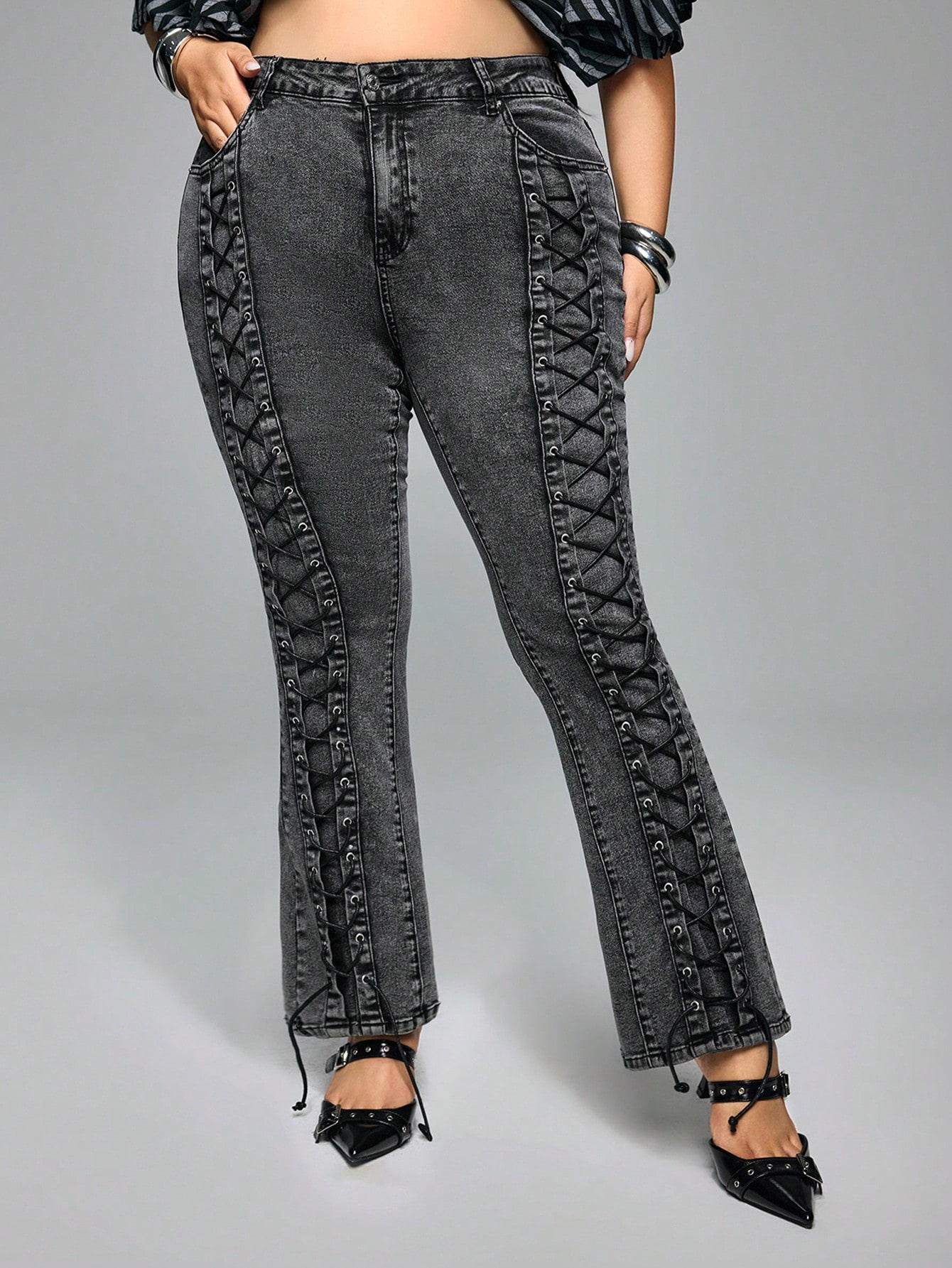Große Größen Gothic Street Style Jeans mit seitlichen Ösen und Schnürung, ausgefranst, weiter Schnitt, Gothic Damen Hosen in Große Größen für Herbst/Winter