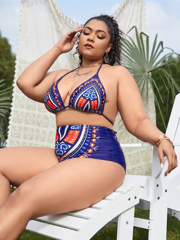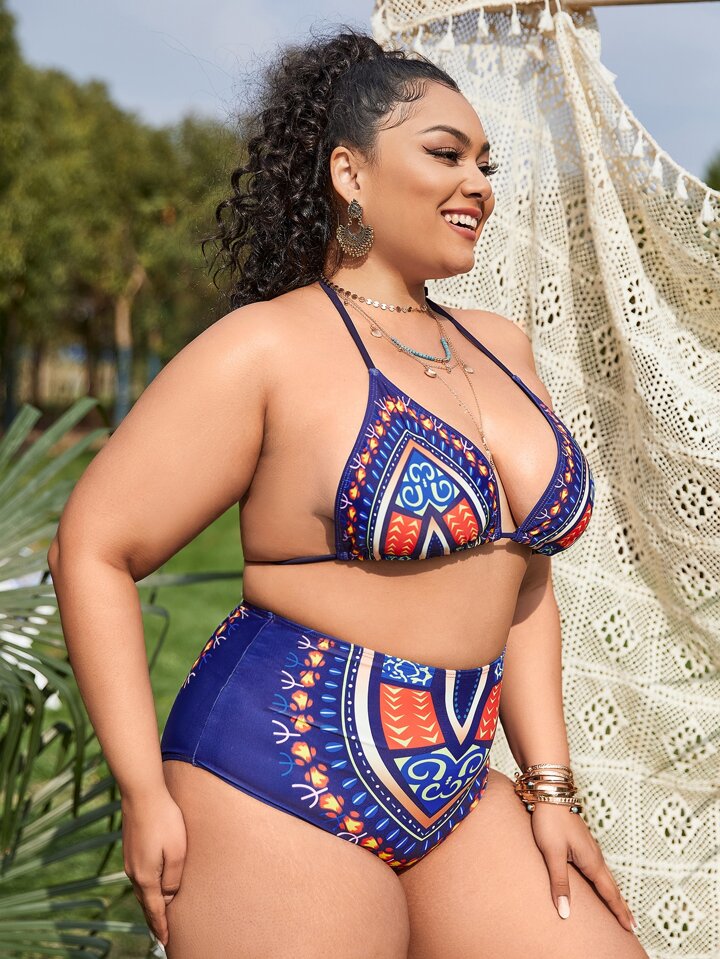 Große Größen Triangel Bikini Set mit grafischem Muster und hoher Taille für den Sommerstrand
