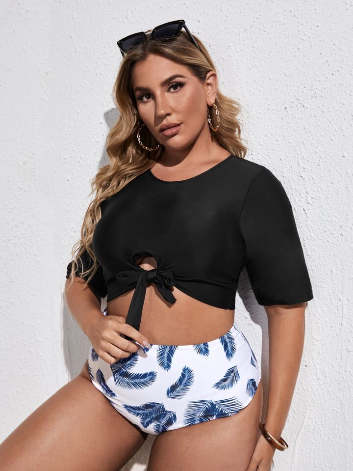 Große Größen Bikini Set mit Palmenblatt Muster, Knotendetail und Kurzarm für den Sommerstrand
