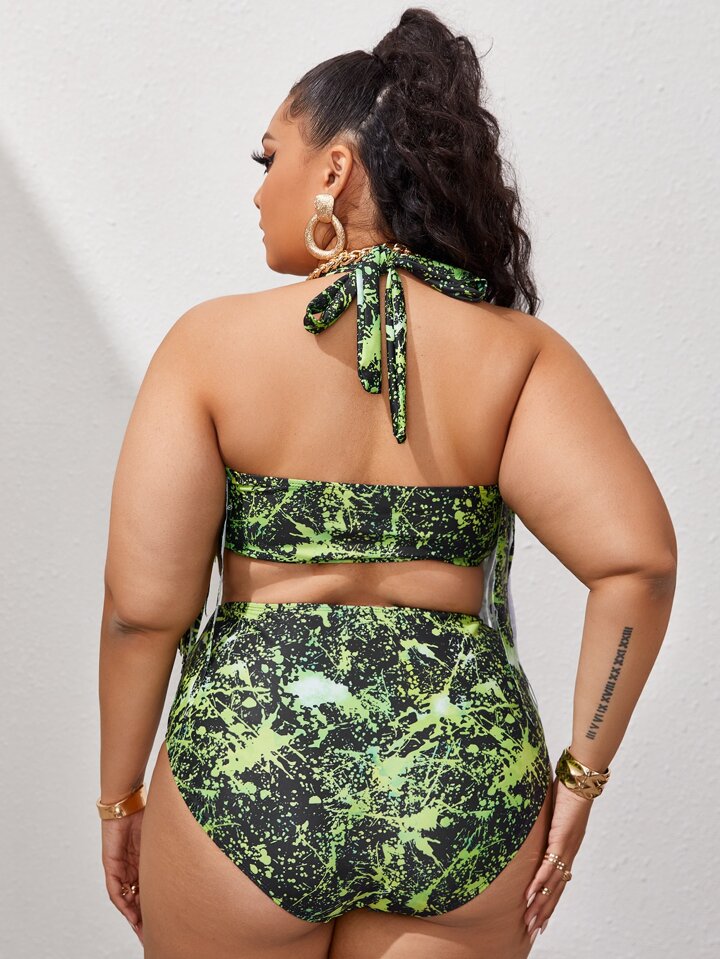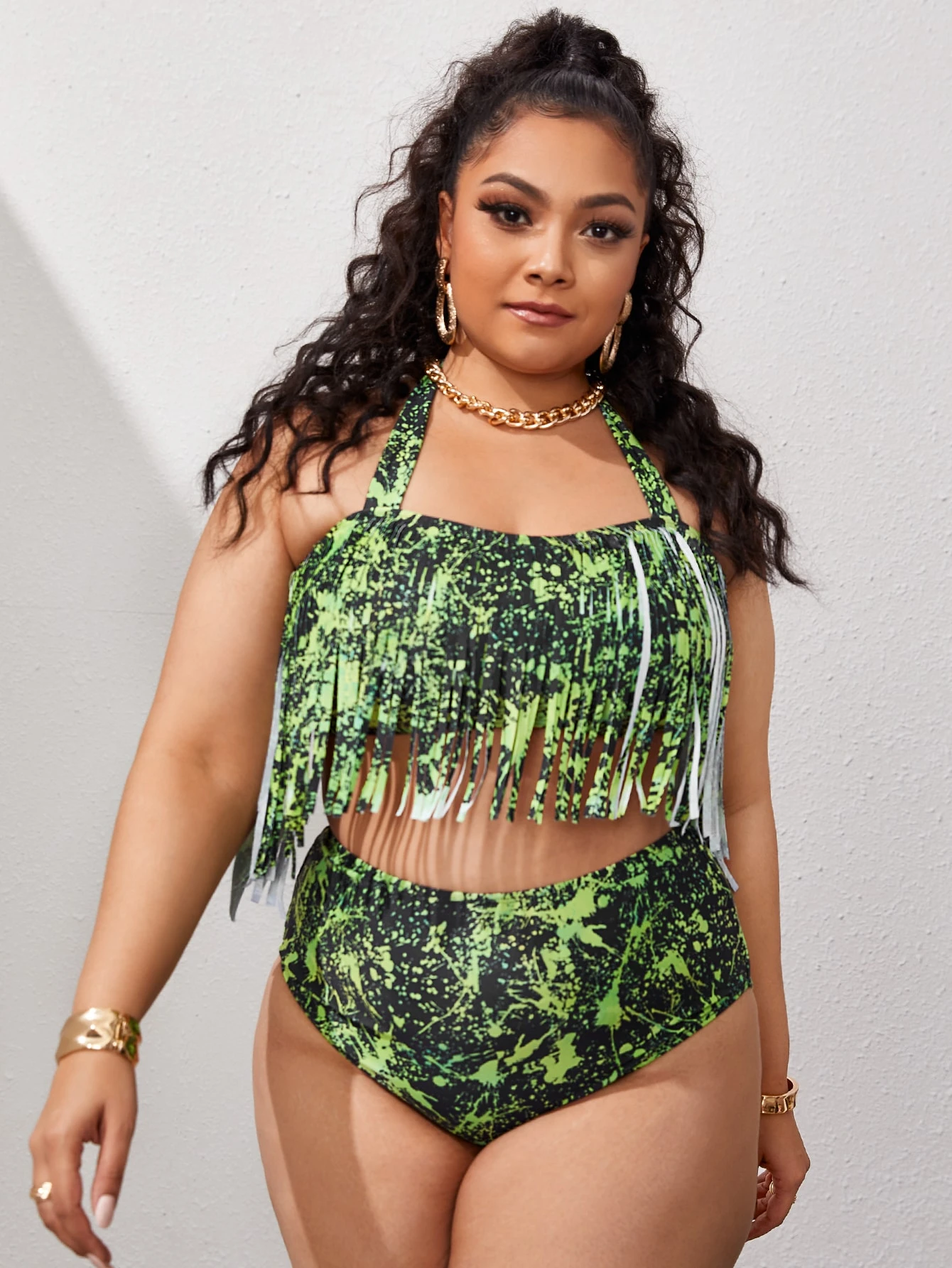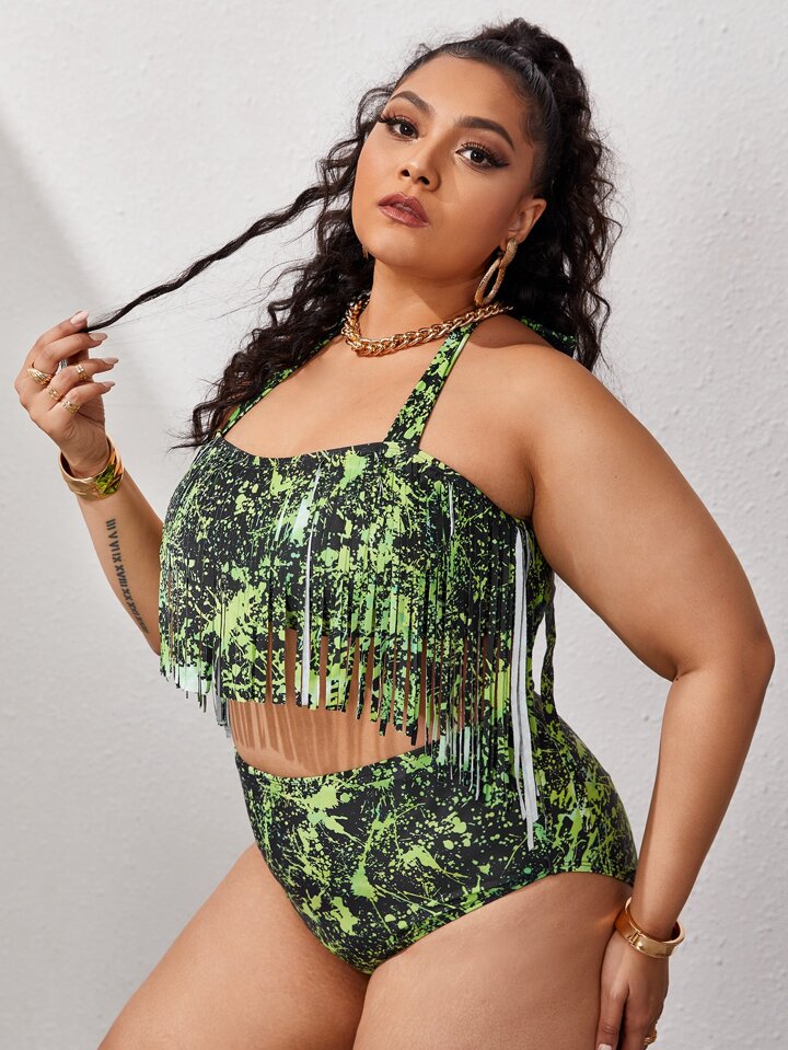 Große Größen Bikini Set mit Spritzwasser Tintendruck und Fransen Saum für den Sommerstrand