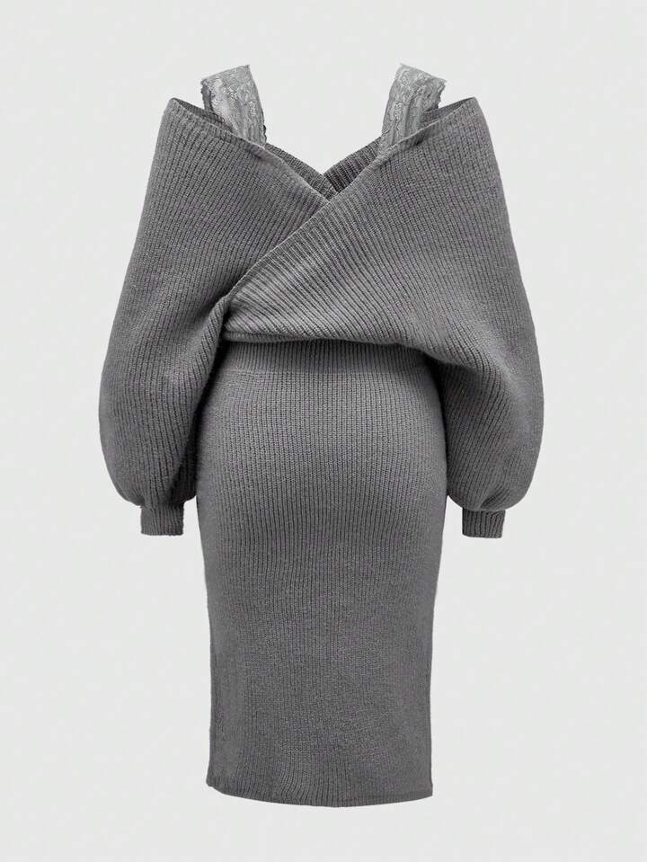 Oversized V-Ausschnitt Spitzen Patchwork Laternärmel Schlitzpulloverkleid für Damen, für den Winter