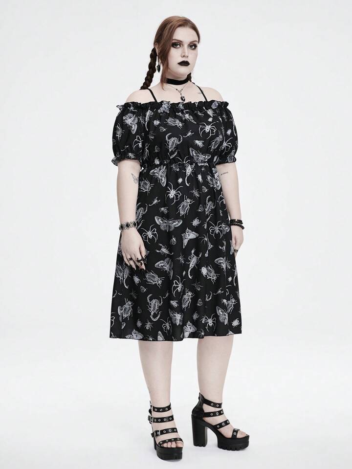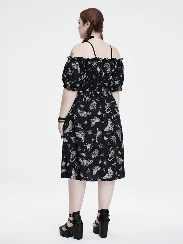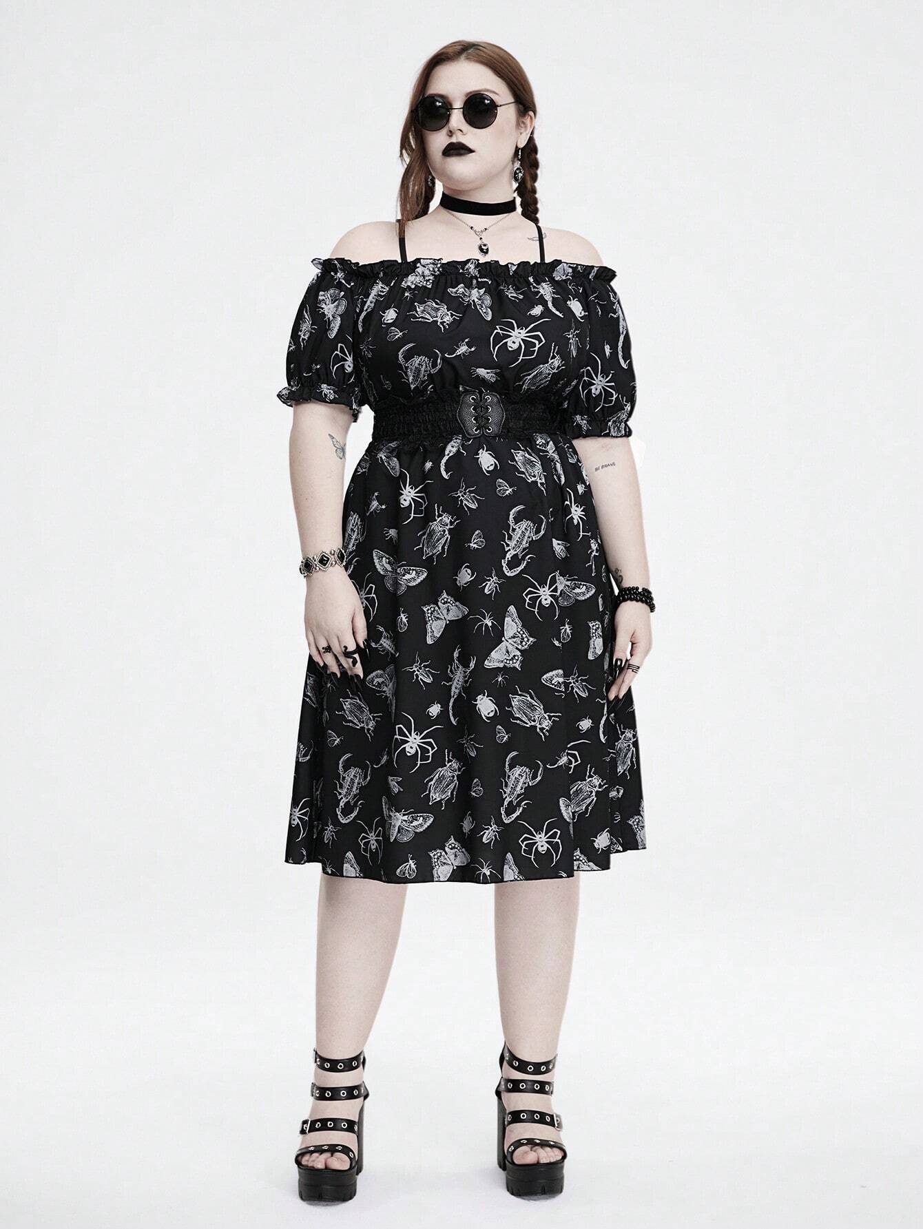 Goth Frauen Große Größen Gotik Insektenmuster Off-Shoulder Minikleid mit geraffter Taille, Sommer