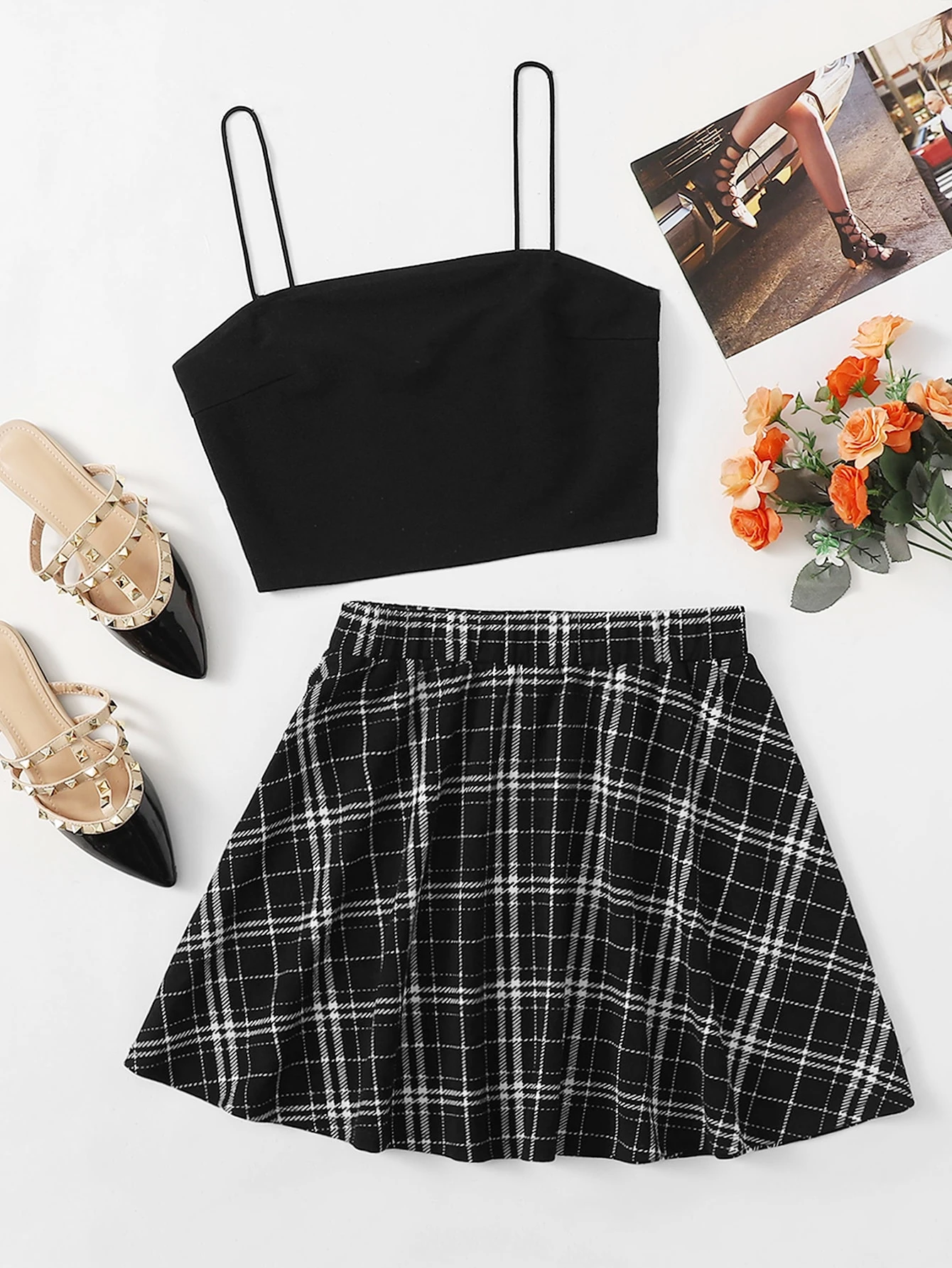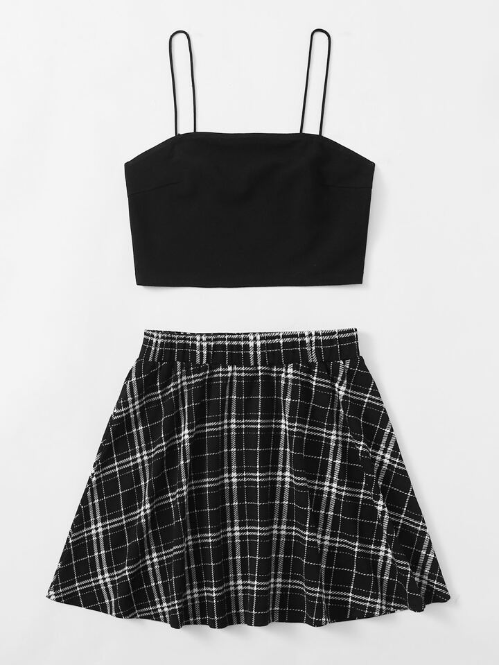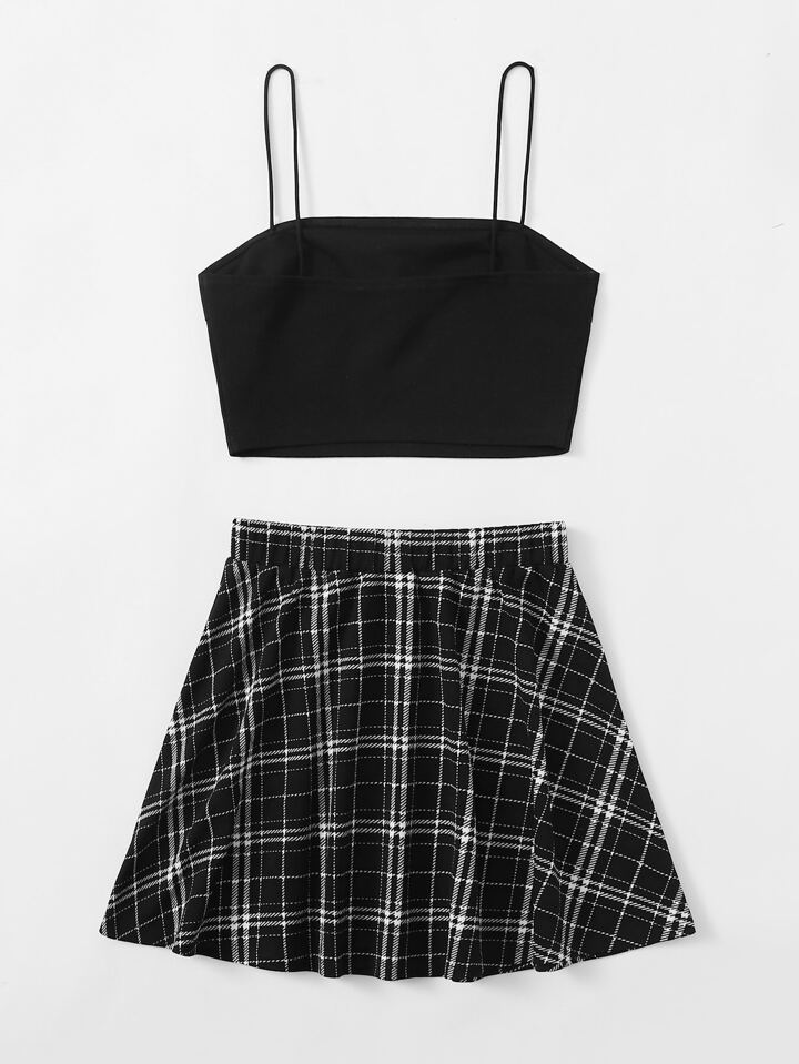 Einfarbiges Crop Cami Top & Rock mit Plaid Muster Set