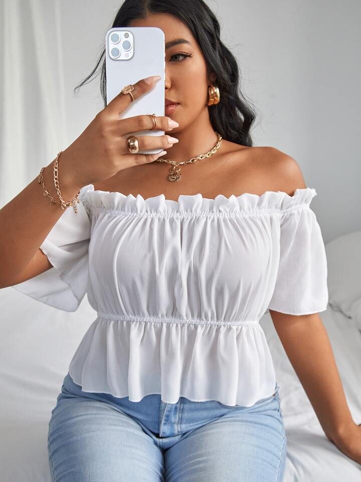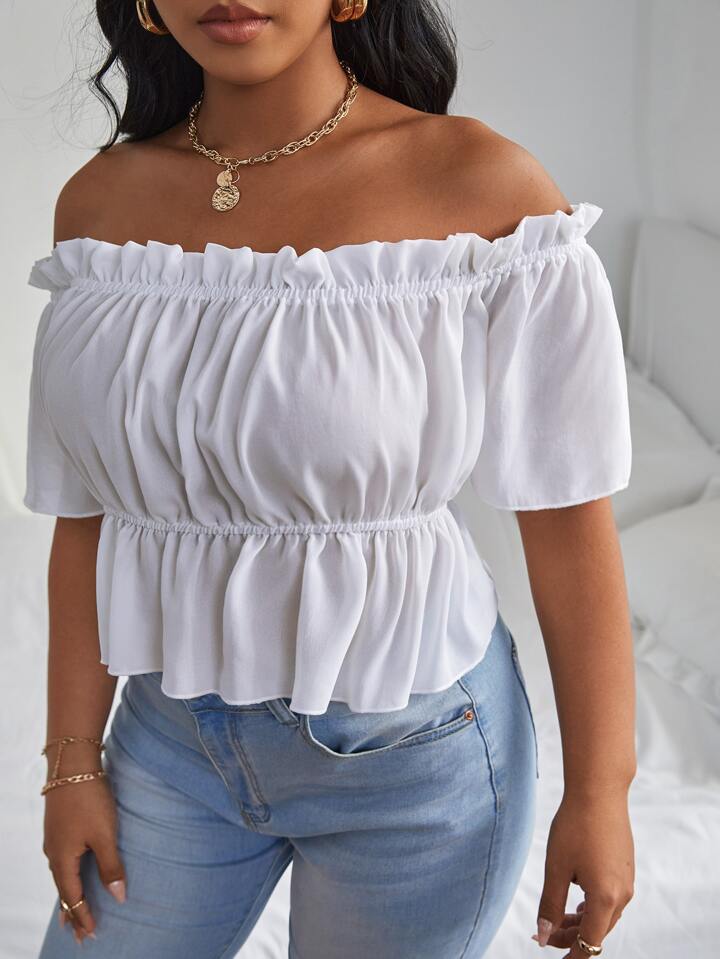 Einfarbige schulterfreie Bluse mit Rüschen