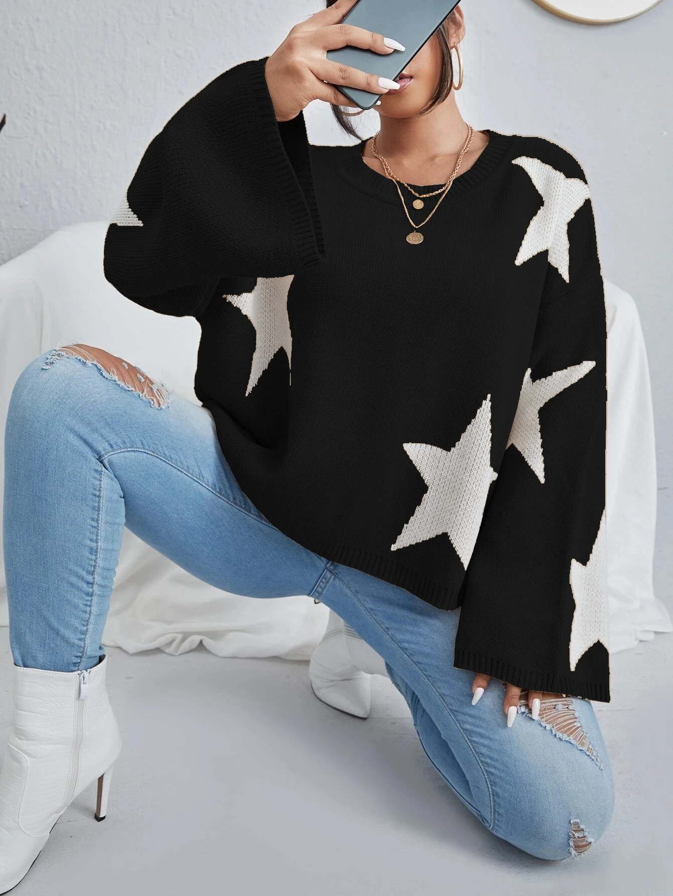 Pullover mit Stern Muster, sehr tief angesetzter Schulterpartie