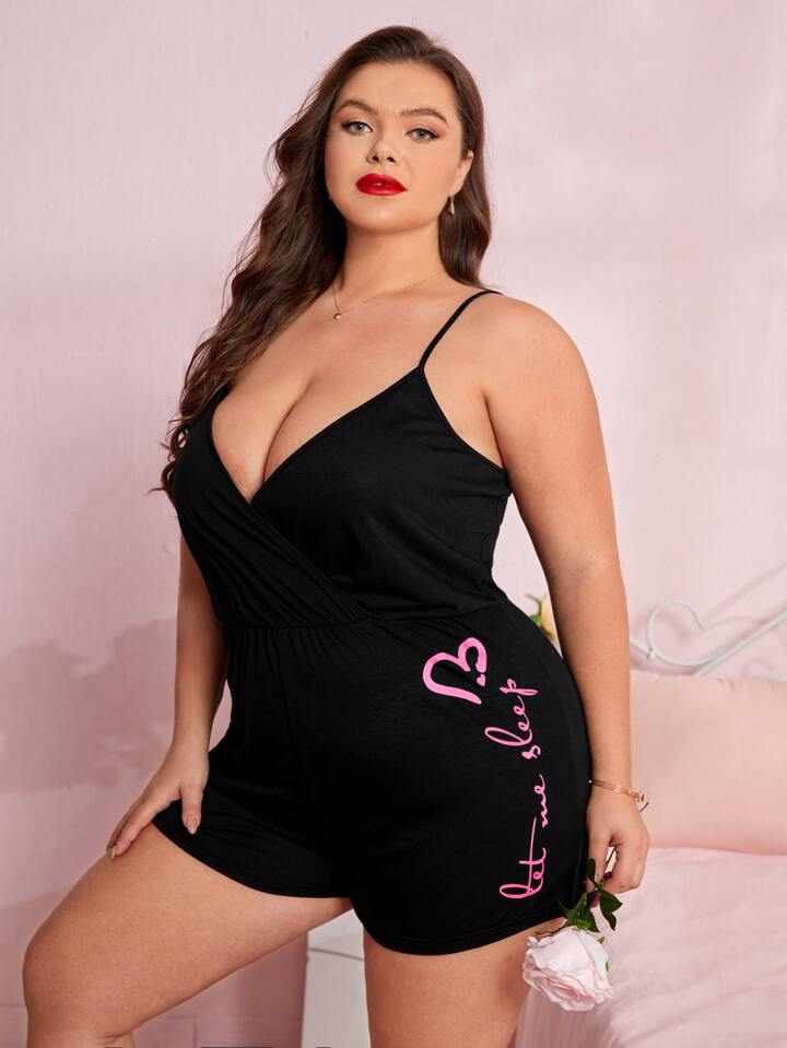 Cami Schlaf-Jumpsuit mit überlappendem Kragen, Buchstaben Grafik