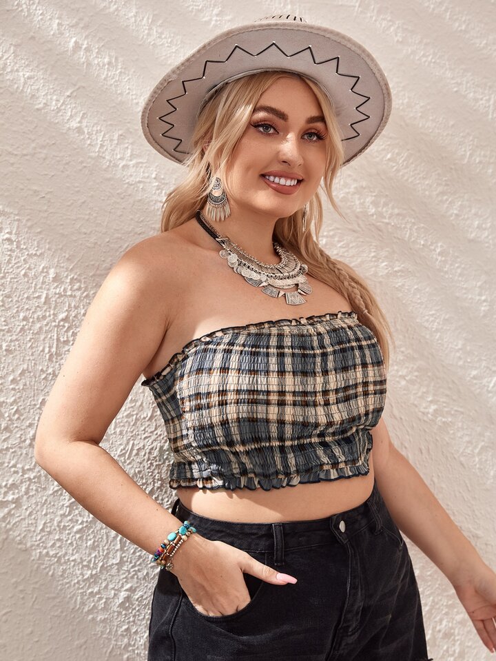 Gerafftes Crop Tube Top mit Tartan Muster und Rüschenbesatz
