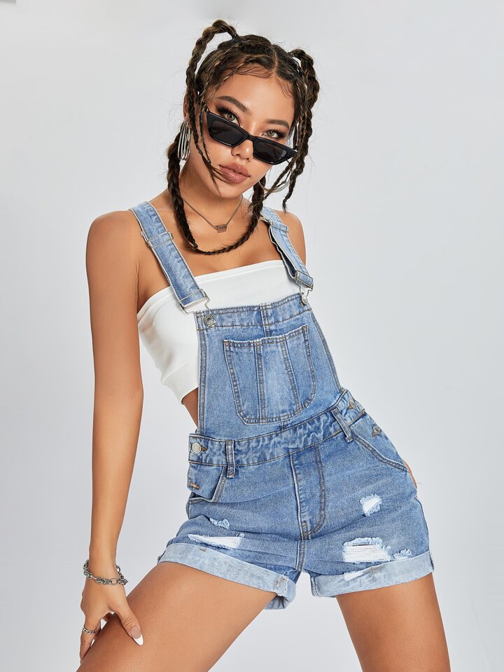 Denim Overall Jumpsuit mit Tasche vorn, Riss, gerolltem Saum