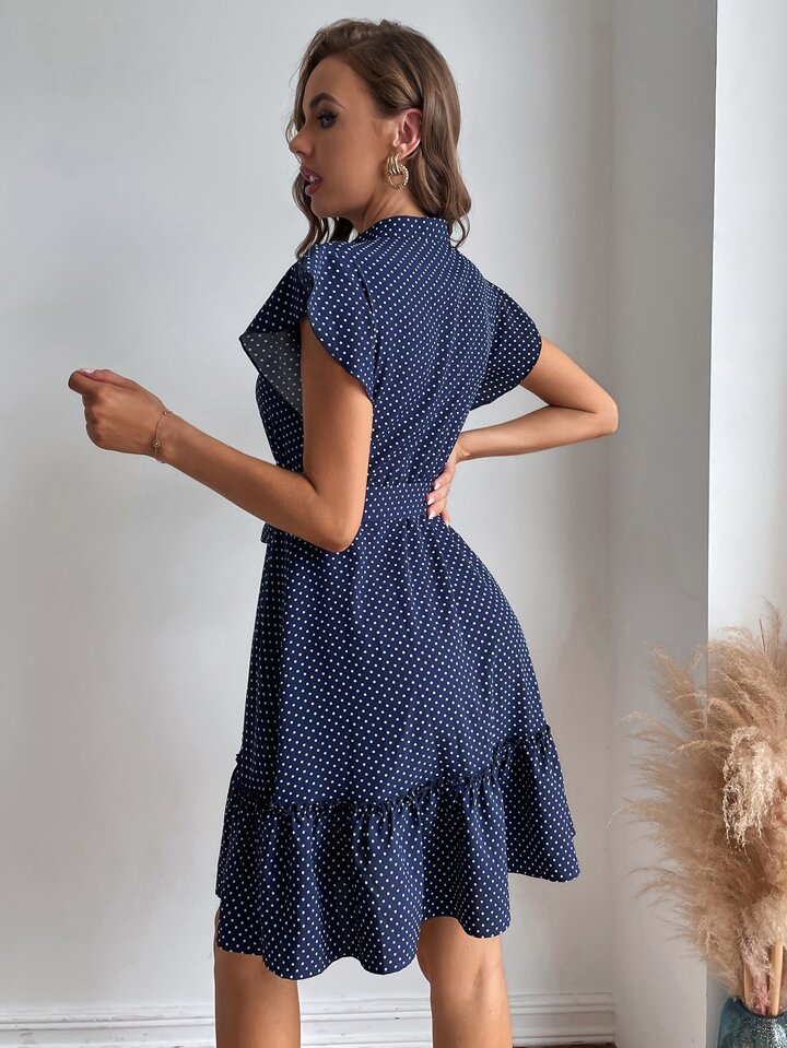 Kleid mit Gürtel, Punkt Muster, Schmetterlingsärmeln, Schößchen am Saum,
